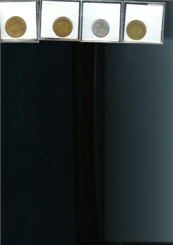 Lot of four merchant tokens. Breton 589 Gesangverein 1887 5 Cents EF, Br:589 Brass Clipped 1887 5 Cents only 100 pieces minted, Br: 619 St.Leon water AL, Br; Magasin St.Gerard/Bon pour 5 sous Brass. Grades vary from EF to UNC.