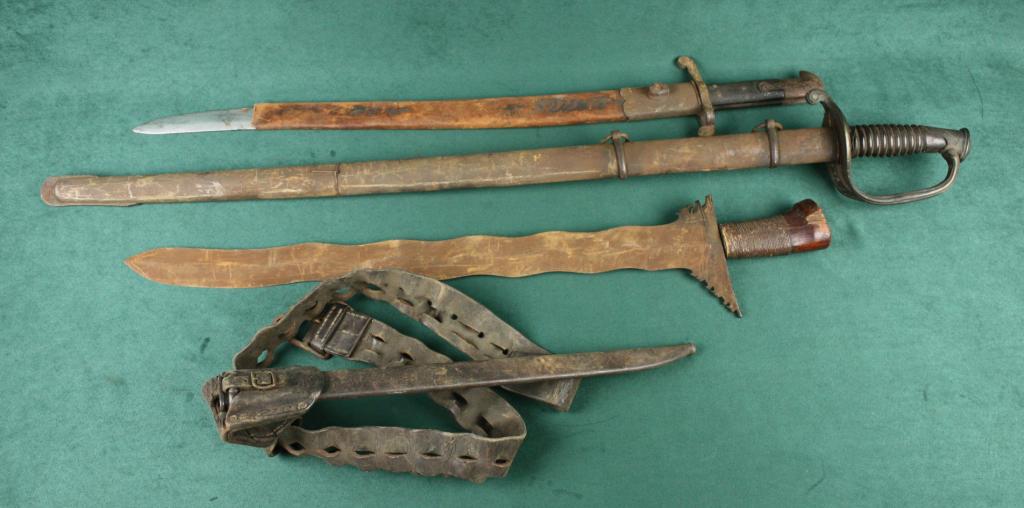 Lot of four misc. blades for the restorer including a European bayonet scabbard, frog and belt; a large bayonet/short sword, also European with partial scabbard; a wavy blade Indochina type sword with wood grip and aModel 1850 type officer’s sword and metal scabbard, unmarked and plain blade, likely European-made circa 1850’s-60’s; all in relic like condition but would improve with a careful cleaning. Est.: $150-$300.