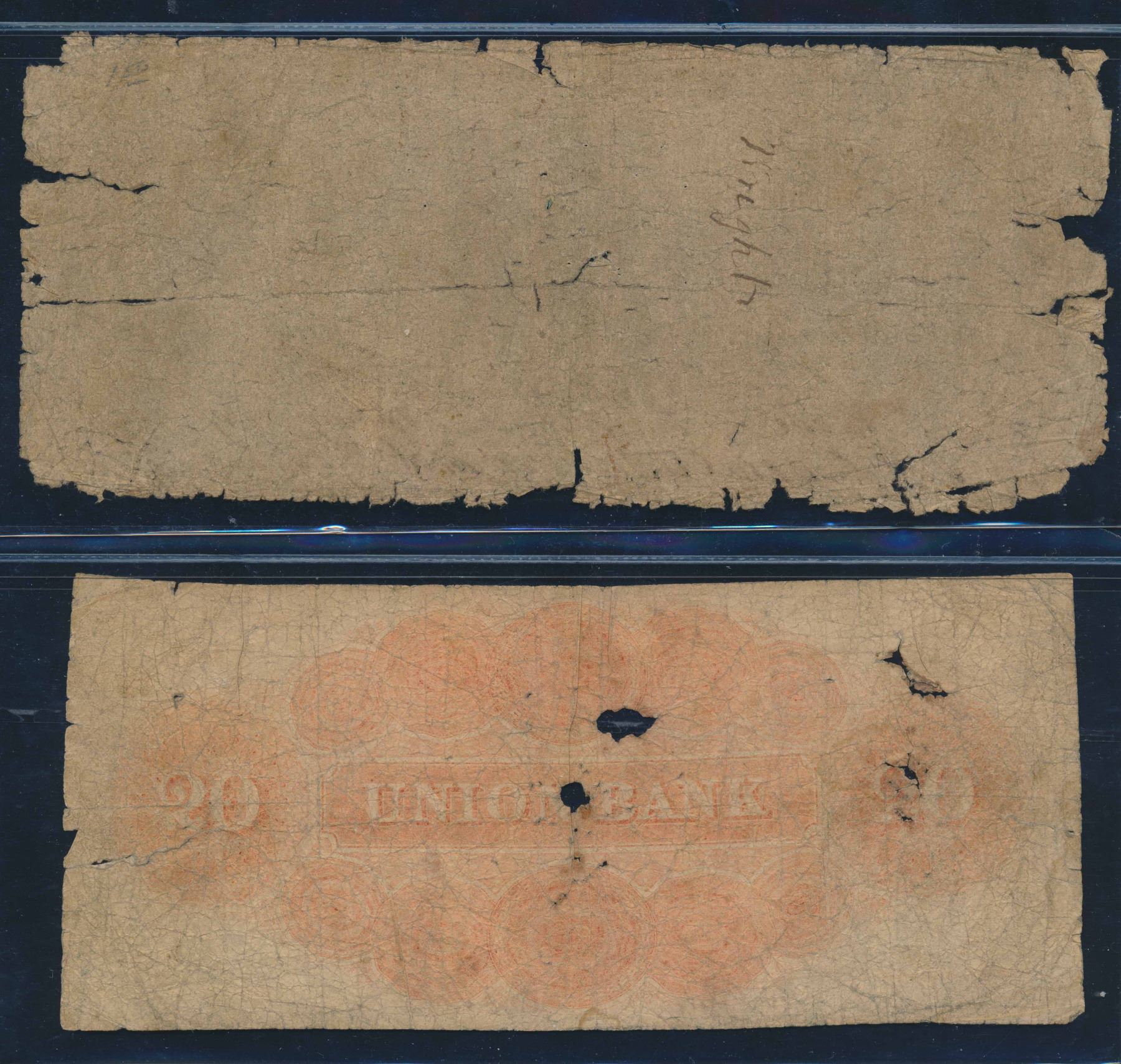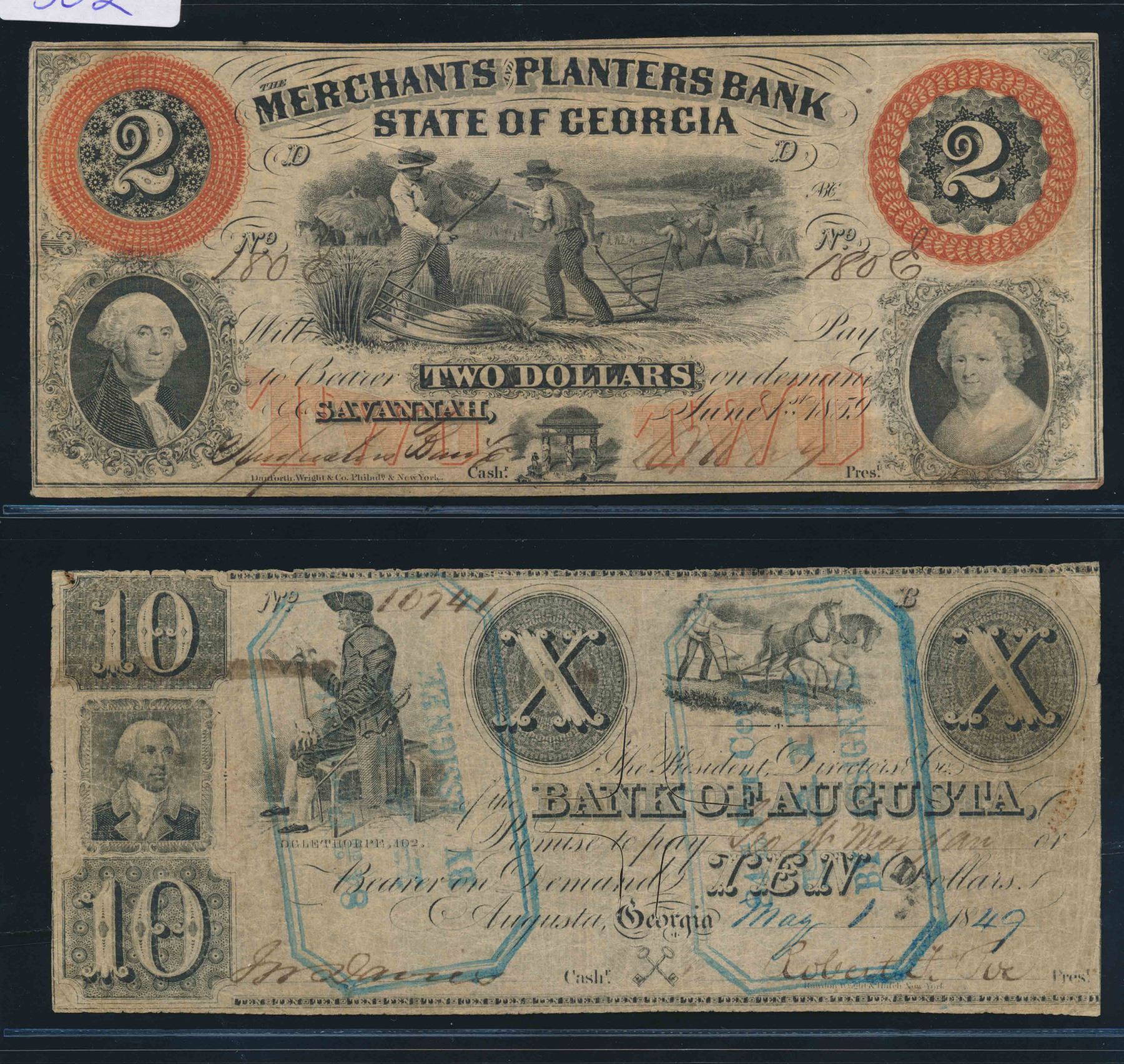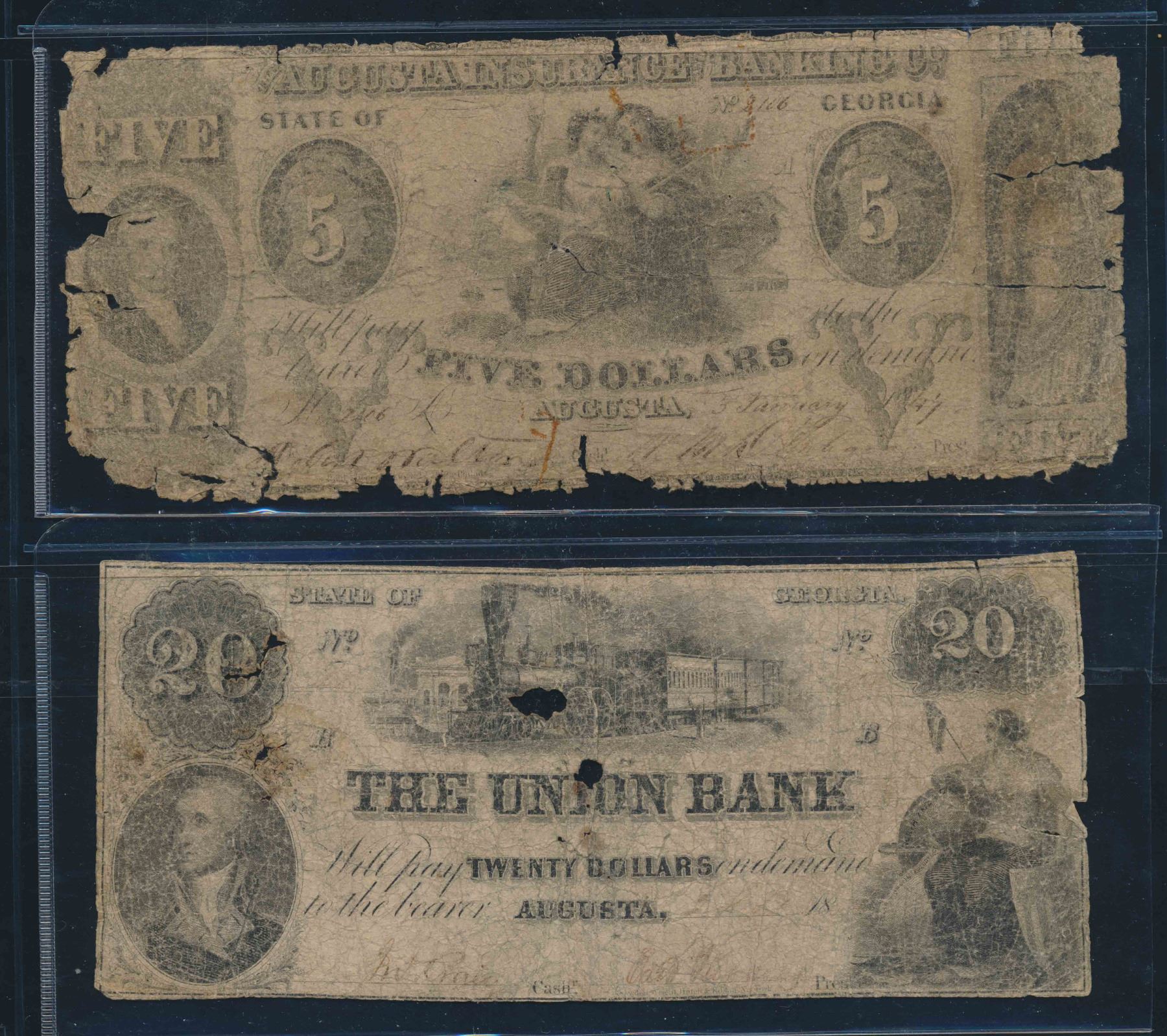 1) Merchants and Planters Bank - State of Georgia 1859 $2 VF+, issued. 2) Bank of Augusta 1849 $10 issued, cancelled with central cut, two stamps. About VF. 3) Augusta Insurance Banking Co. , State of Georgia $5 1847 Poor 4) Union Bank, Augusta Georgia 18?? $20 Several piercings, with two major ones near center