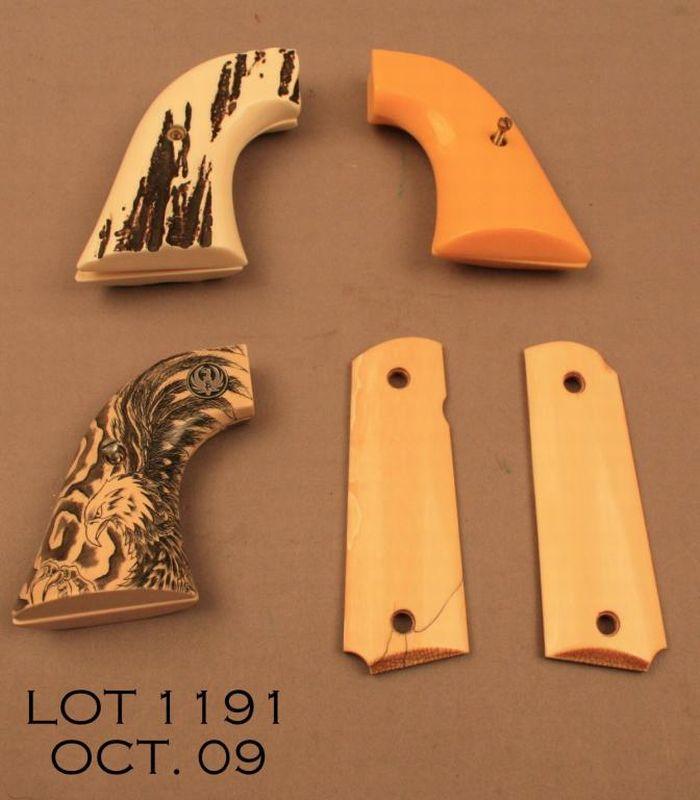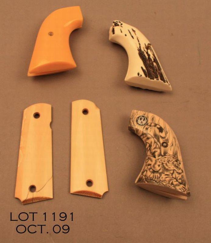 Lot of four pairs of grips including pair of bone grips for a Colt 1911; a pair of faux stag for a SAA; a pair of faux ivory for a SAA and a pair of scrimshawed faux ivory grips for a Ruger Blackhawk revolver, all in very good condition. Est.:$150-$300.
