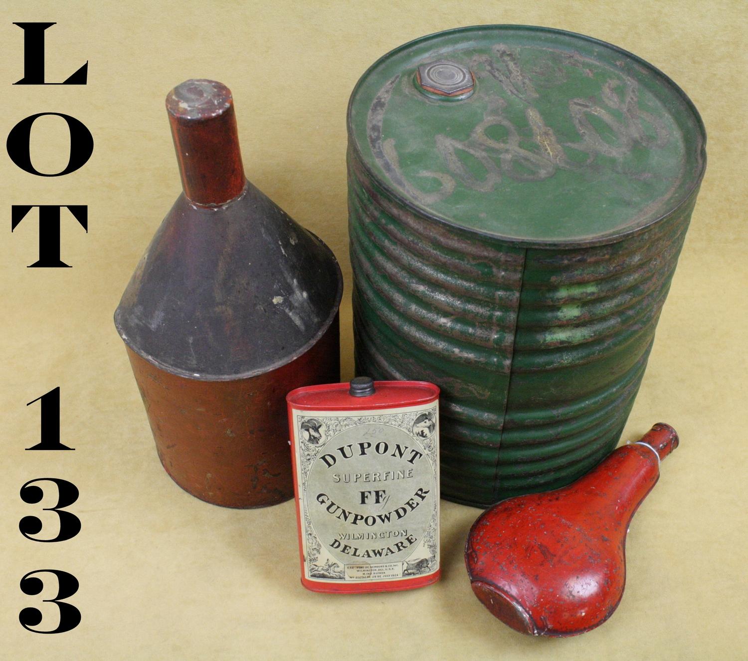 Lot of four powder tins including a large DuPont Rifle can, approx. 11” tall and approx. 9” in diameter; a Dupont Superfine FFg flask style can, a flask style can approx. 9” overall and a large oil can styleflask approx. 14” tall with a large handle. Est.: $175-$350.