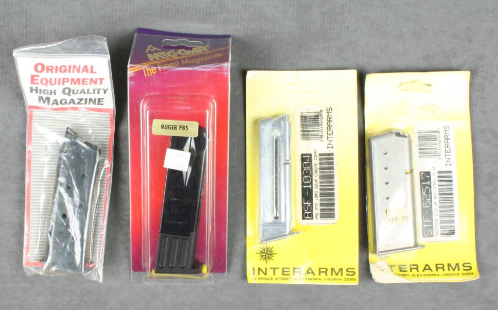 Lot of four semi-auto pistol magazines including a Meggar new in the box for a Ruger P85; a new Interarms magazine for a Firestar .45; a new Interarms standard 10 round .22LR cal. magazine and a Brolin Arms Co. 7 roundmagazine for a Compact Officer’s .45. Est.: $50-$100.