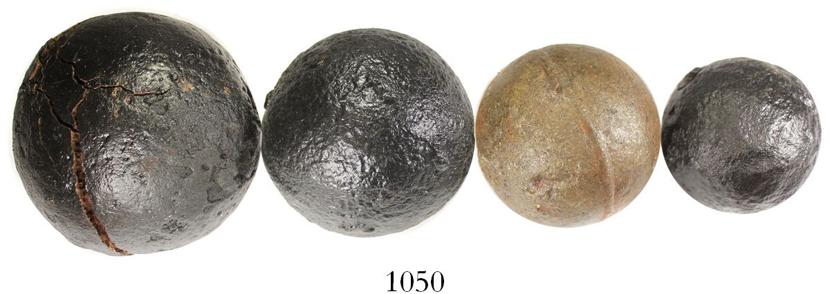 Lot of four small to medium-sized iron cannonballs. 3.92 kg total, diameters of 2" to 3-1/4" each. All typically black except for one that is chocolate brown in color, the largest ball with cracks from expansion and possibly unstable without further conservation, otherwise all intact and not overly corroded. From an unidentified 1500s-1600s wreck off Santo Domingo, with Global Marine Exploration photo-certificates #BP0041, 43, 49 and TPA0031. Recovered from: Unidentified 1500s-1600s wrecks off Santo Domingo