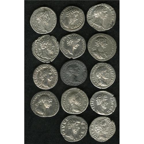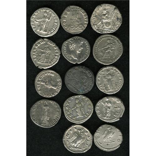 <B>Lot of fourteen denarii of the Adoptive emperors.</B></I> Includes: Nerva // Trajan (3) // Hadrian // Aelius // Antoninus Pius (2) // Antoninus Pius with Marcus Aurelius, as Caesar // Marcus Aurelius (3) // Lucius Verus (2). Average Fine to VF, several better pieces in the group. Fourteen (14) coins in lot.