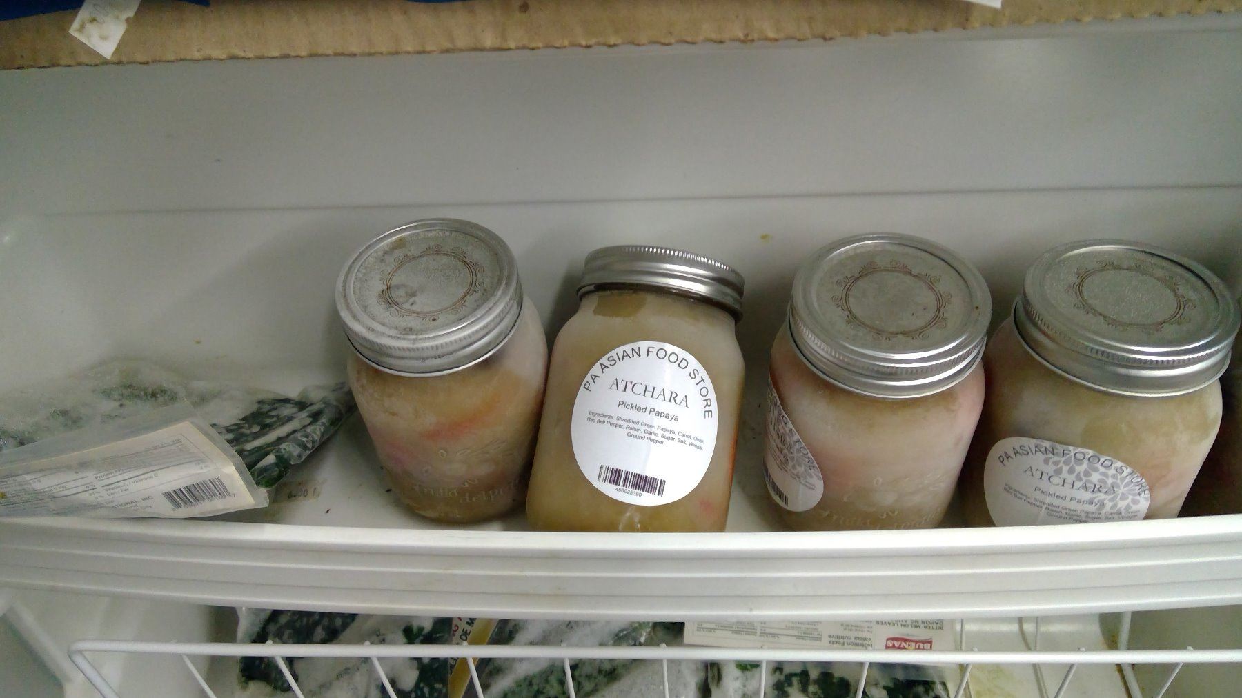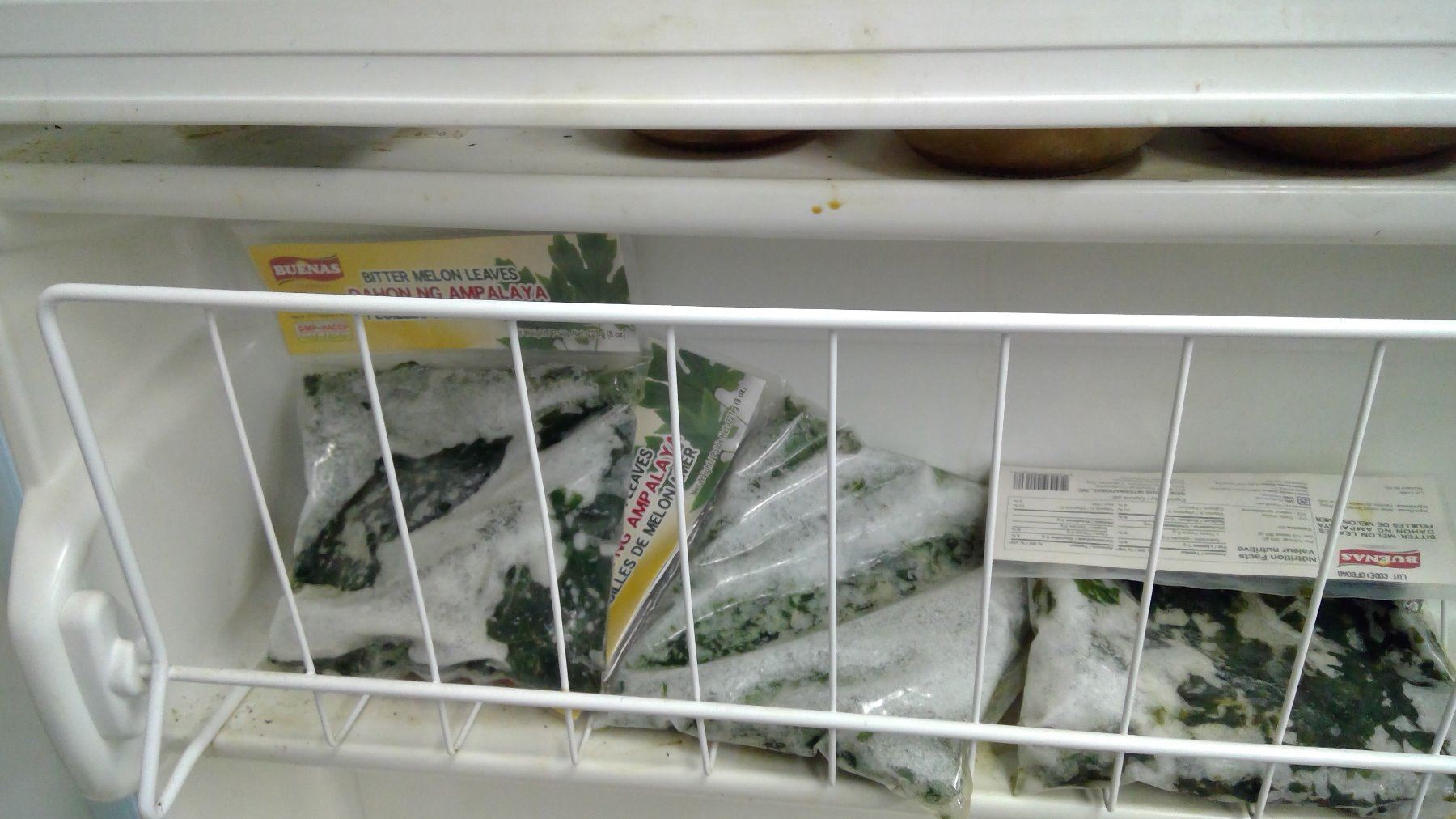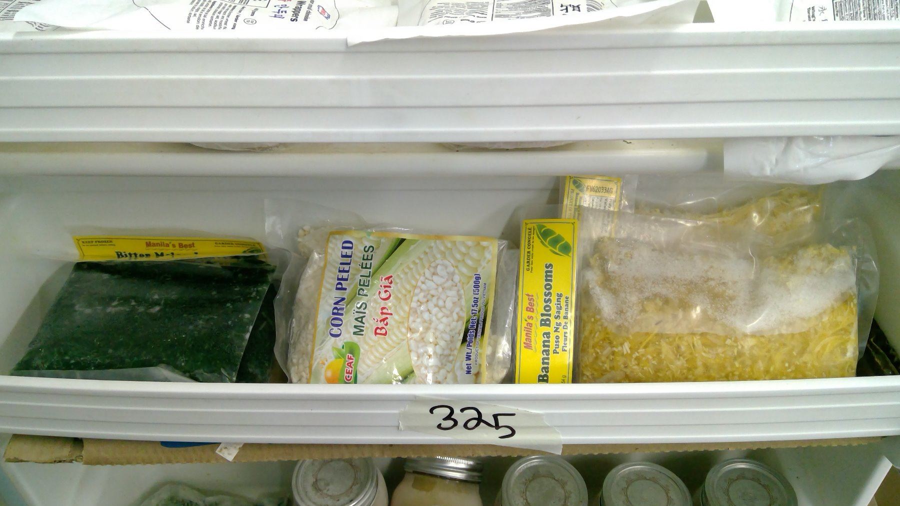 Lot of frozen dumpling wrappers, corn, bitter melon, pickled papaya, etc