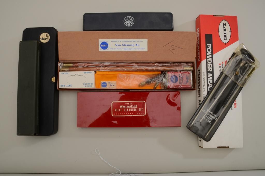 Lot of gun cleaning kits of various makes and a powder measuring kit; great for the gun collector’s/shooter’s work bench or for the gun show circuit. Est.: $50-$100.