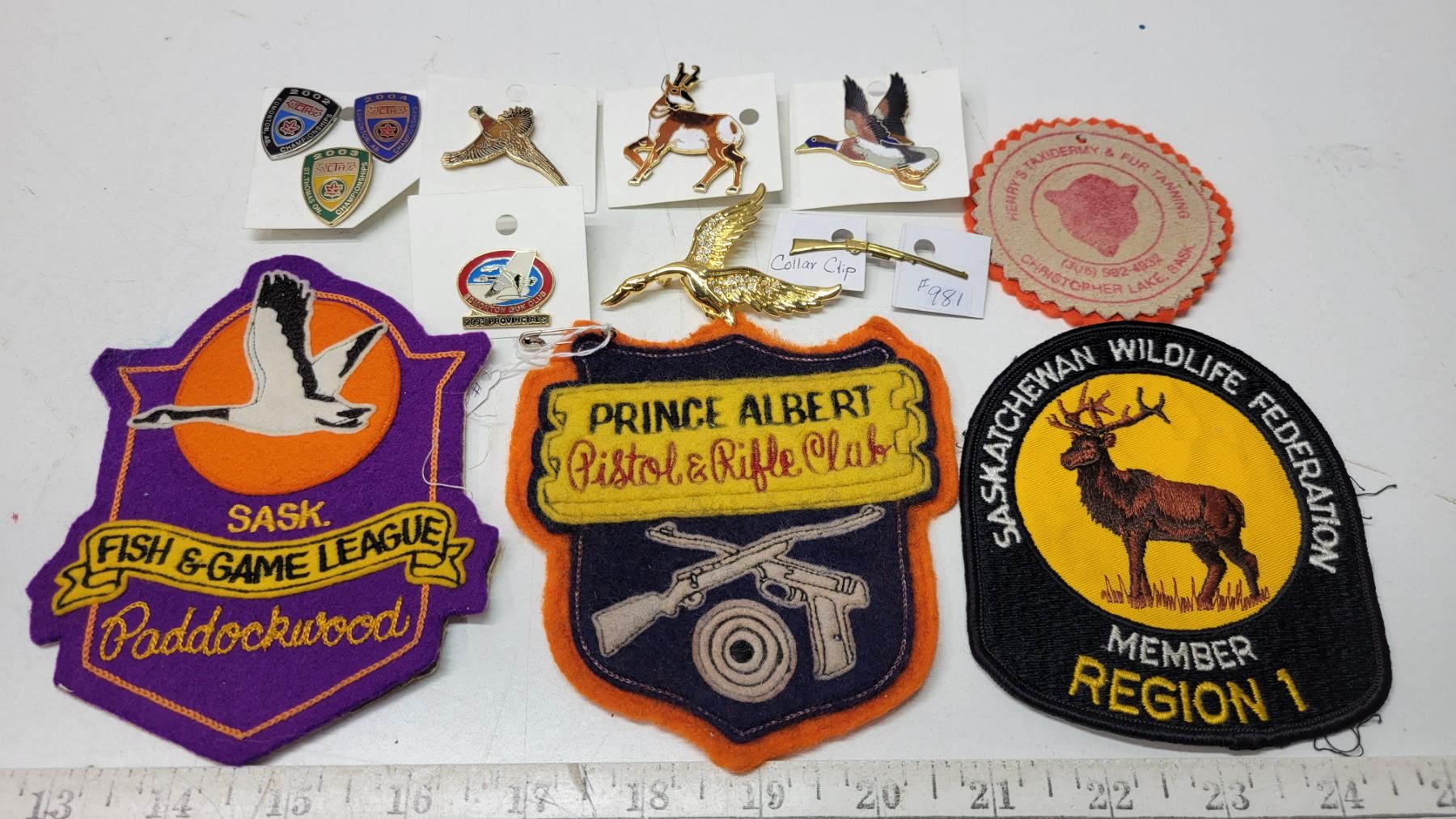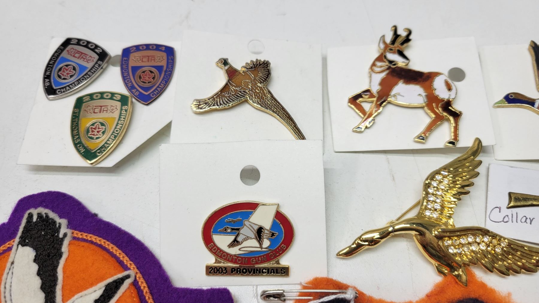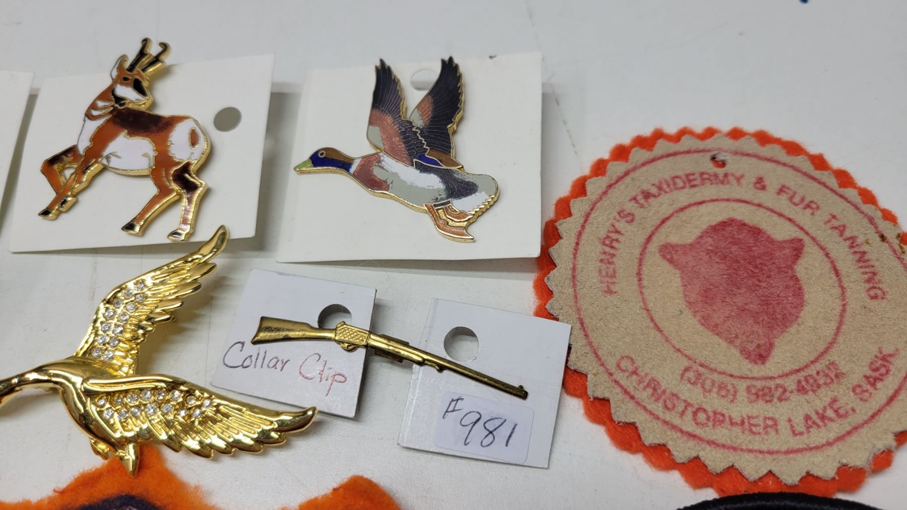 Lot of “hunting-related”, crests, lapel pins, collar pin