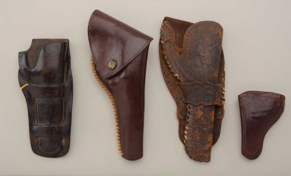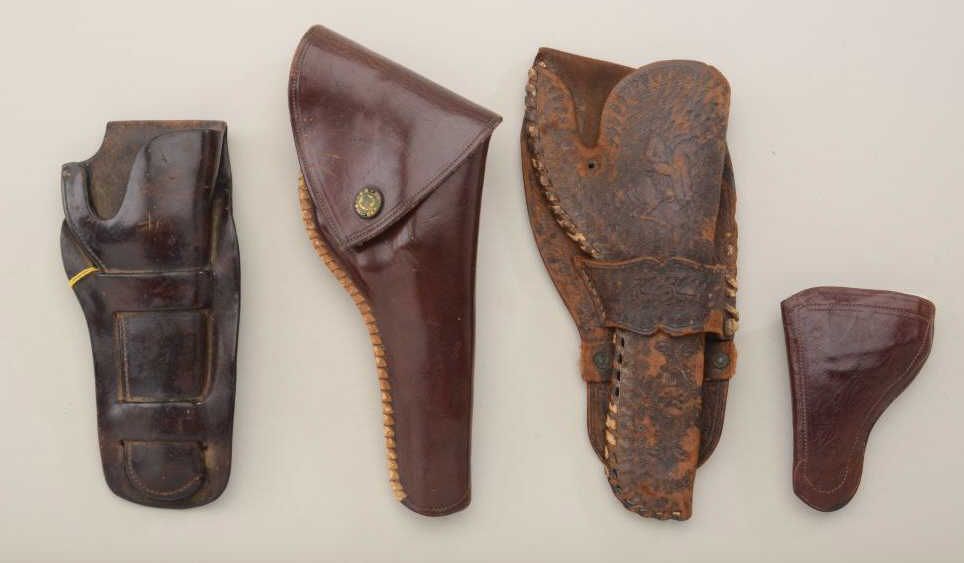 Lot of leather holsters, six total: 1) Heiser Denver flap holster for 5-1/2" single action, #431, very good condition, name scratched in small letters Wall's; 2) embossed leather holster showing cowboy,florals, game scenes for 7-/12" single action, DA Smith & Wesson or Merwin, condition poor; 3) Mexican made leather holster for medium to small frame 5" revolver with American style cartridge belt, 38loops, good condition; 4) a thin leather chamois lined small frame revolver holster with nickel plated belt loop, 1920s-40s, good condition; 5) Heiser Denver medium size revolver holster, probably .38 smith or colt, 1910-1915, good condition; 6) early 20th century 1900-1920 circa Mexican holster for small frame revolver with 2-1/2" barrel, double loop, 32 size cartridge loops with matching belt, good condition, very cute.Est.: $350-$700