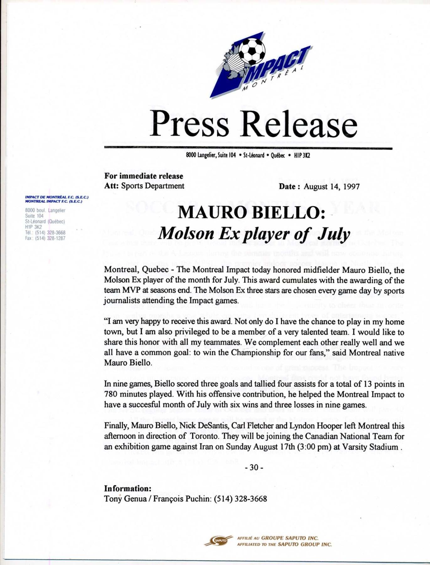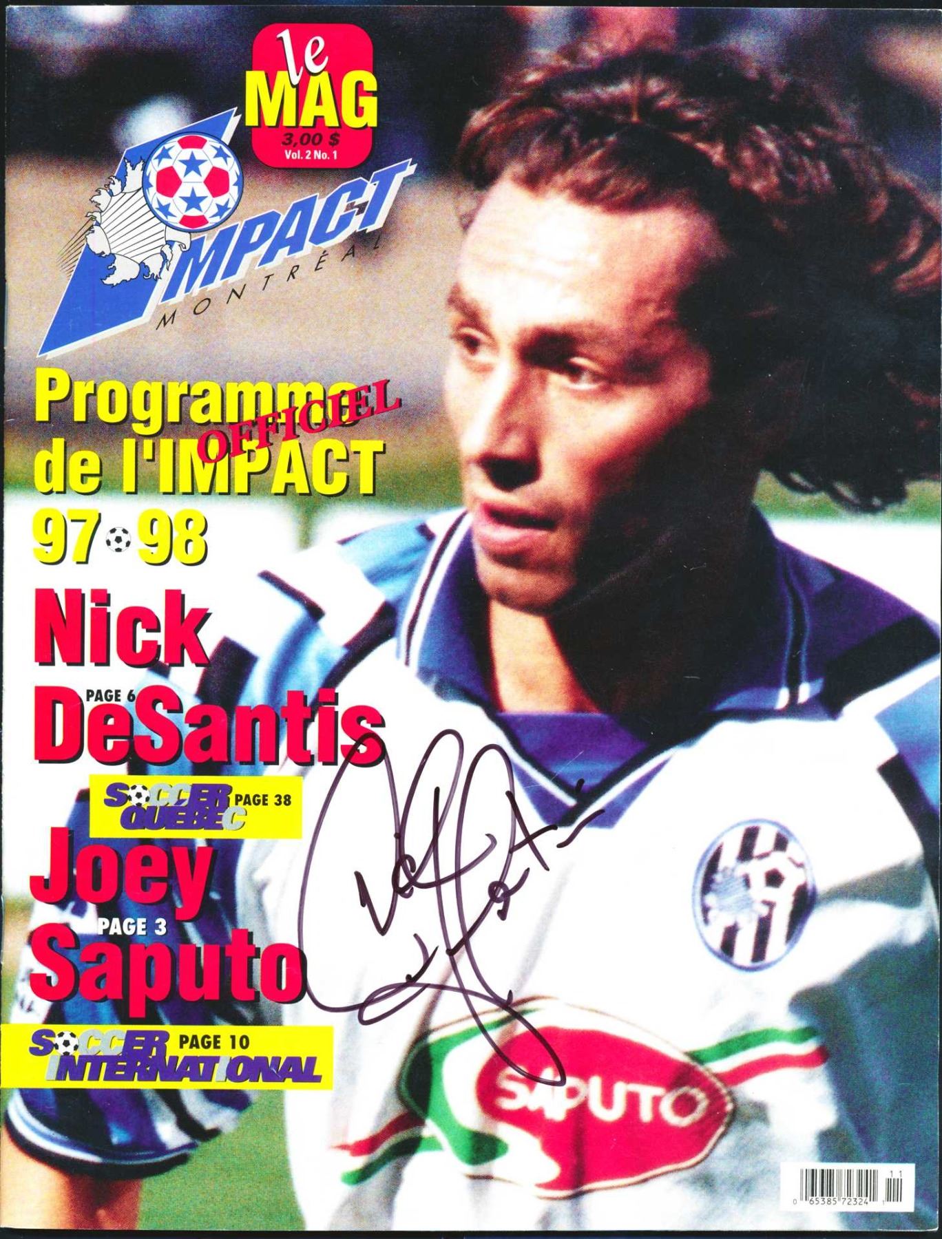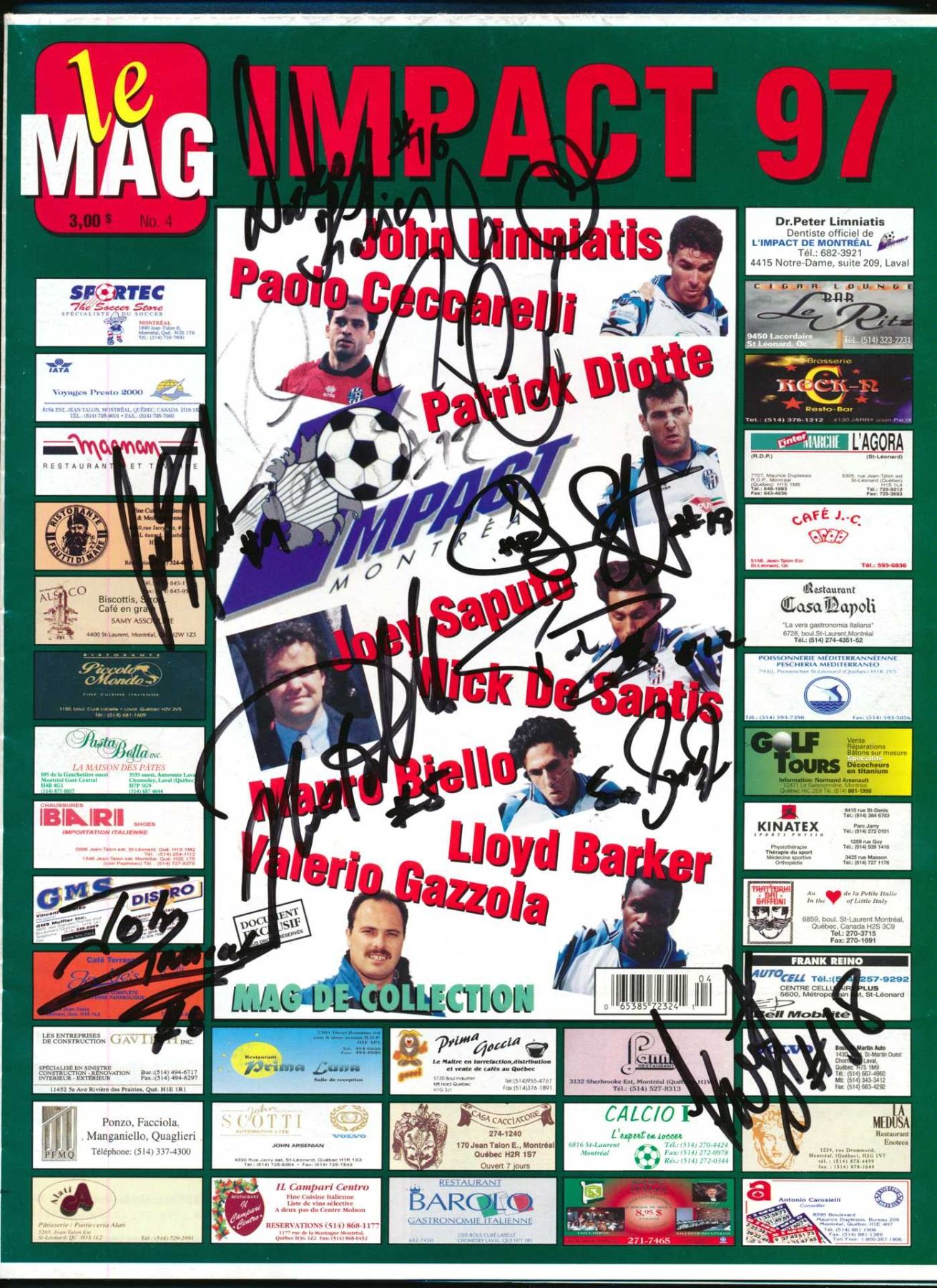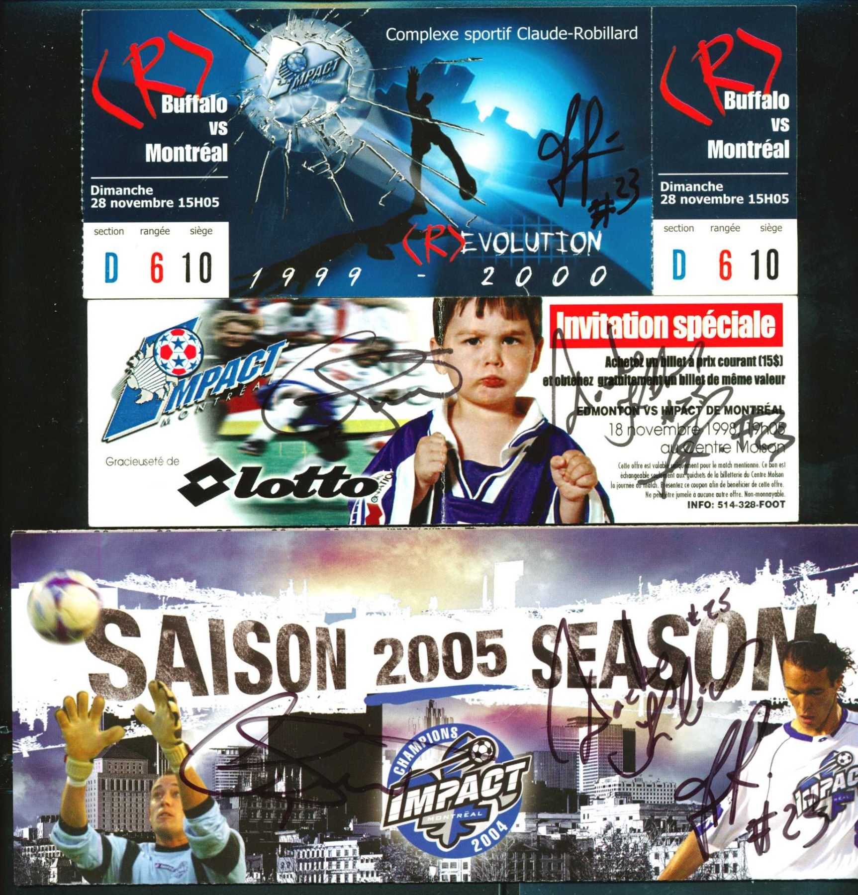 Lot of 24 various items autographed by the members of the Montreal Impact, such as game tickets, magazines, flyers and photos. Joey Saputo , Nick deSantis , Igniatio Piatti and Mauro Biello to name a few as well as an official team document concerning Mauro Biello in 1997.
