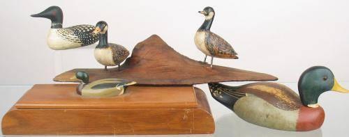 Lot of miniatures including a pair of geese mounted together on a wooden base, a mallard drake by Charlotte Spencer and signed on the bottom, a loon with a William Zeiher, Hibbing, MN gummed label on the bottom, and a cigarette box with a mallard drake mounted on the top by Wildfowler Factory, Old Saybrook, CT. c. 1947 in good condition with a small chip to the paint on the lower left side of the duck. (decoy)