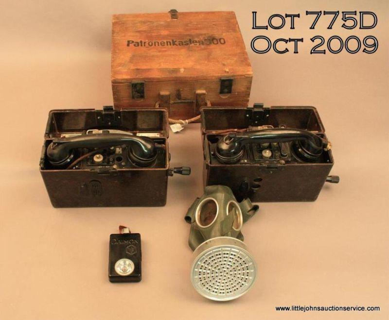 Lot of misc. German military gear including field phone set, ammo box, gas mask and flash light. Est. $200 - $300