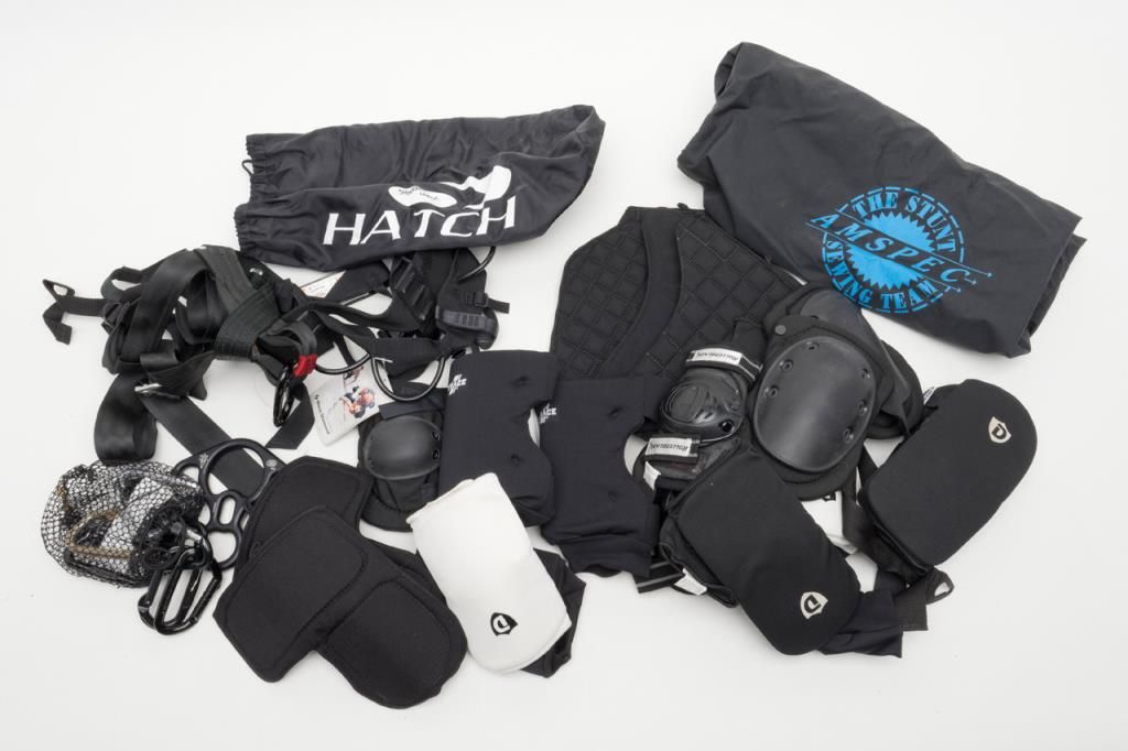 Lot of misc. Hollywood stunt gear including pads, rappelling gear, etc. in black stuntman’s team carry bag. Est.: $100-$150.
