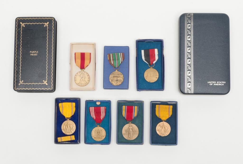 Lot of misc. U.S. medals including an American Defense Service Medal with bar and pin in box; a WW II Campaign and Service medal in box; an American Defense medal in box; a European, African, Middle Eastern Campaign medal in box; anArmy of Occupation medal in box; a Good Conduct medal (in incorrect box); an Expeditions medal in a white American Defense box; an empty Purple Heart display blue case and an empty generic U.S.A. blue display case. Est.: $50-$75.