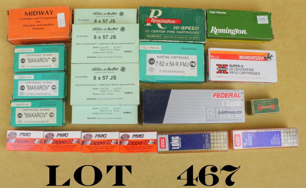 Lot of misc. ammunition boxes, mostly full including 45-70, .35 Remington, .22 long and short, 8 X 57 JS; .22LR, 9 X 18mm, .243 Win, 22-250, 8mm Nambu and 7.62 X 54R. Est.: $75-$150.