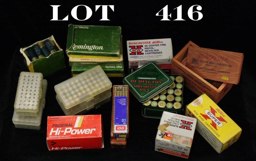 Lot of misc. ammunition including 20 gauge by Winchester, .410 by Remington and by Winchester, Ducks Unlimited Commemorative 12 gauge tin, .22LR by Western, Winchester and Federal, CCI .22 ammo, .45 Colt, .45 ACP., 30 Carbine, .25 auto, .380 auto, 9mm, etc. Est.: $75-$150.