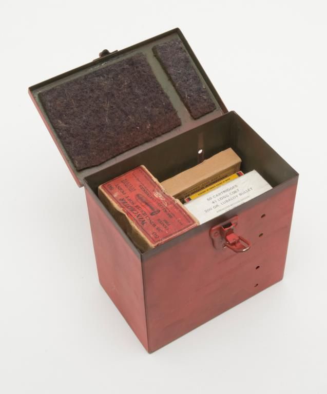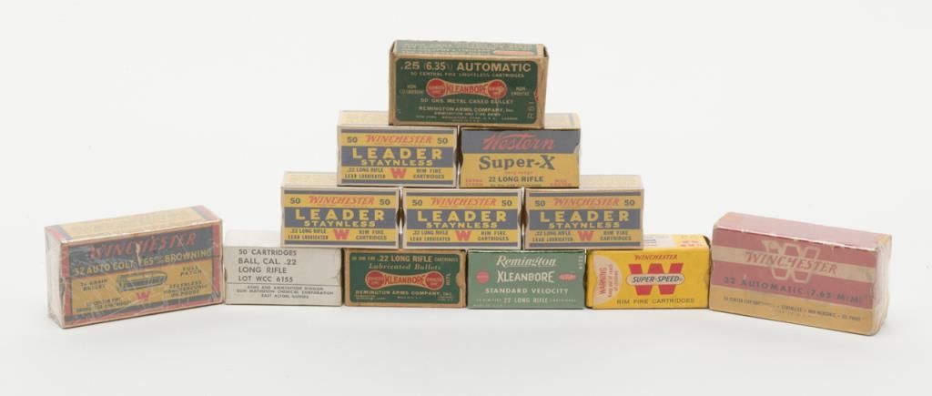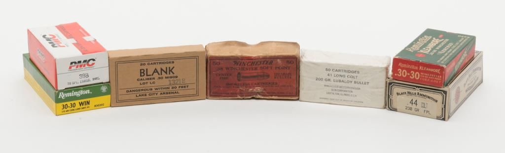 Lot of misc. boxes of ammunition, mostly collectible including 1 box of Winchester .32 automatic; 1 box of Lake City Arsenal .30 cal., M1909 blanks; 1 box of Winchester .32 auto Colt; 4 boxes of Winchester Leader Staynless .22LR; 1 box of Western Super-X .22LR; 1 “dog bone” box of Remington/UMC .25 auto; 1 “dog bone” box of Remington/UMC .22LR; 1box Remington/DuPont .22LR; 1 partial box of Winchester Super-Speed .22LR; 1 box .22LR Olin Mathieson; 1 box Winchester-Western Div. of Olin Corp. .41 Long Colt; 1 partial box Remington/DuPont .30-30 Win. Express; 1 partial box of Remington .30-30 Win.; 1 box PMC .38 Special; 1 box Black Hills Ammunition .44 Colt and a partial box of Winchester .38 Winchester SoftPoint red label); all contained in an old red metal carry box. Est.: $150-$300