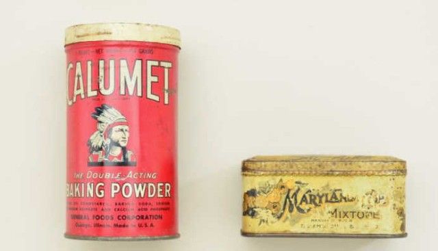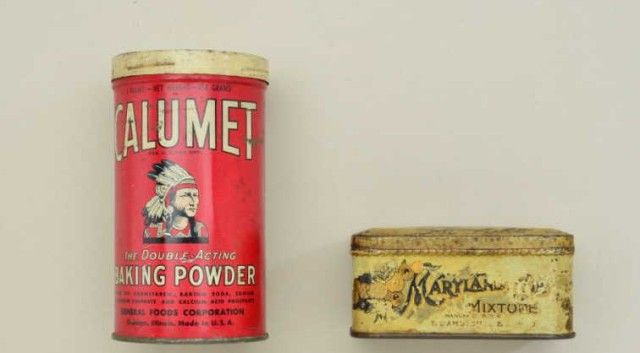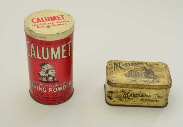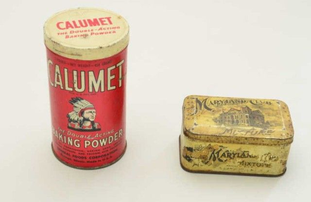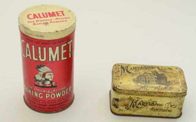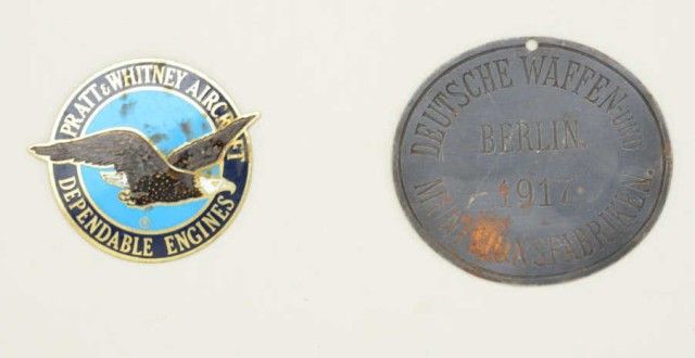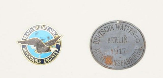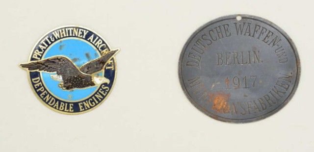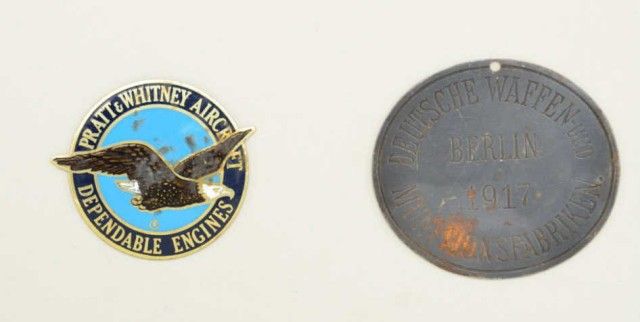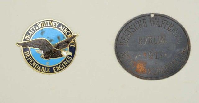 Lot of misc. collectibles including a Pratt & Whitney Aircraft Engine plaque, a German DWM 1917 dated plaque, two commemorative ribbons, an old Calumet tin and a Maryland Club tobacco tin. Est.: $25-$50.