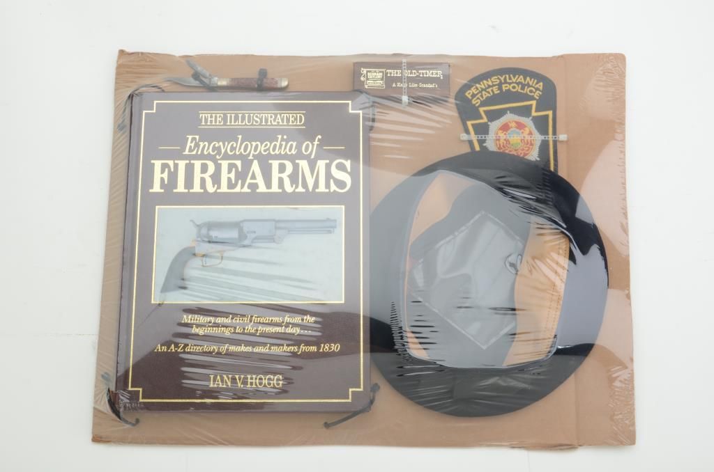 Lot of misc. collectibles including a U.S. Navy black soft cap (size 6-7/8) in very good condition, a Pennsylvania State Police Trooper shoulder patch, a small Camillus two blade folding knife in Schrade “Old-Timer”cardboard shipping box and a copy of Ian Hogg’s Encyclopedia of Firearms in good condition. Est.: $50-$75.