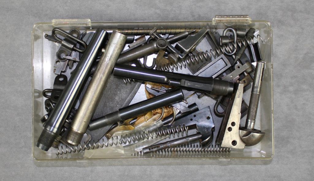 Lot of misc. gun parts including a S&W .45  cal., barrel possibly for a Model 1917, a New  Service Colt barrel in .38 Special cal., a  Colt ’60 Army frame only, variety of sights,  springs, screws, etc.  Great for thegunsmith.  Est.:  $125-$250.
