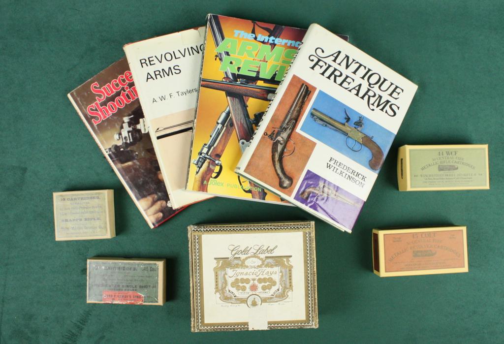 Lot of misc. gun related reference books, old cigar boxes, and misc. Books include “Gun Talk” by Moreton; “Revolving Arms” by Taylerson; an original copy of the Far West Hobby Shop’s Catalog No. 7 featuring theDavid L. Ingalls Collection, “Antique Arms” by Wilkinson; “Pawnee Bill” by Glenn Shirley. Great for research. Est.: $50-$100.