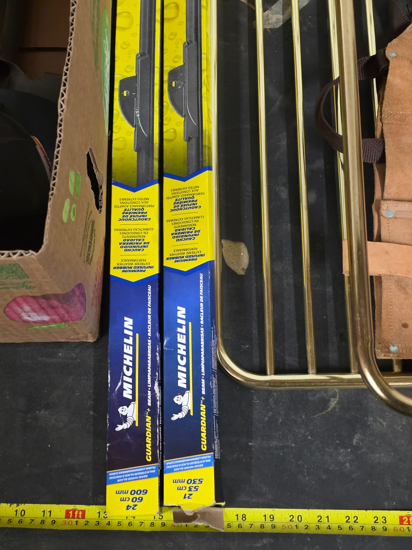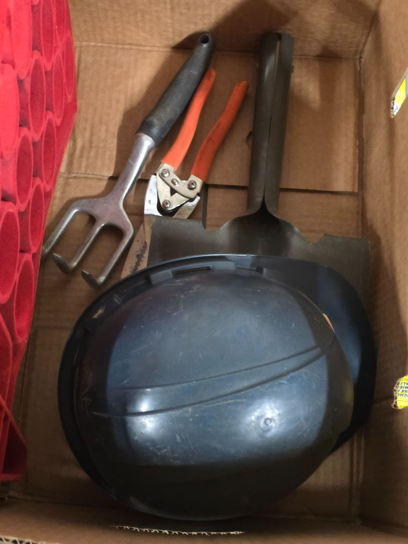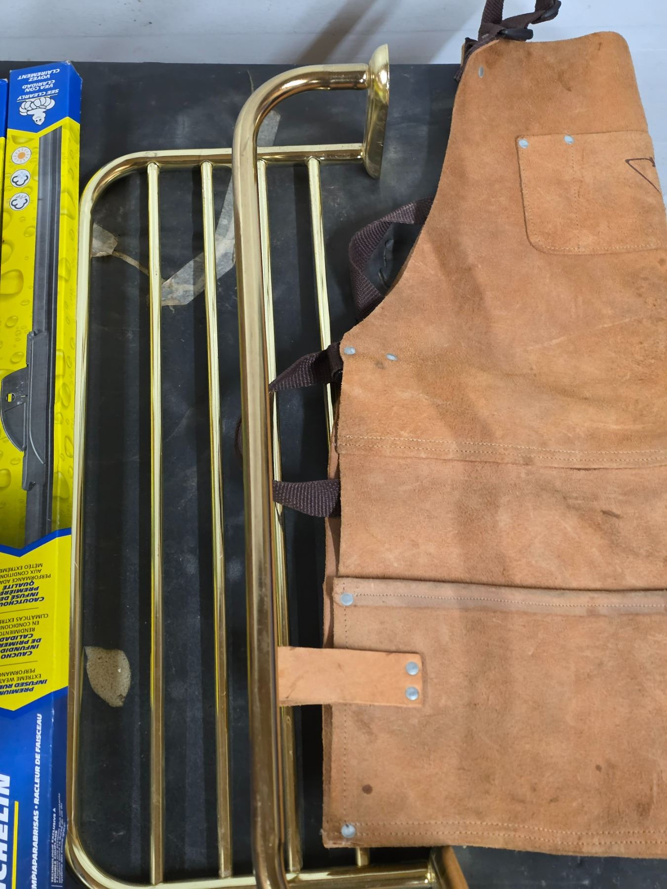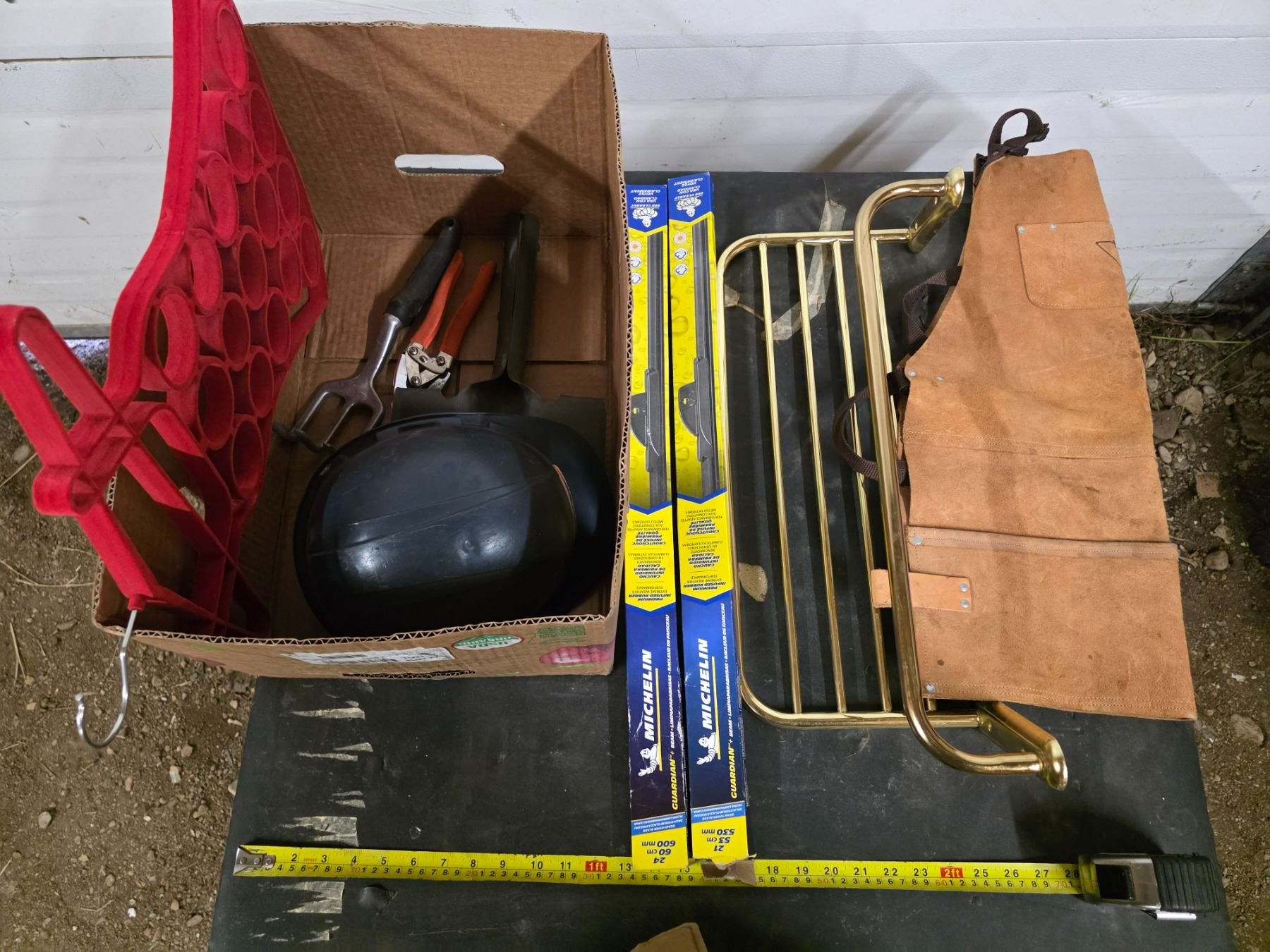 Lot of misc items, wipers, hard hat, spade, tool apron