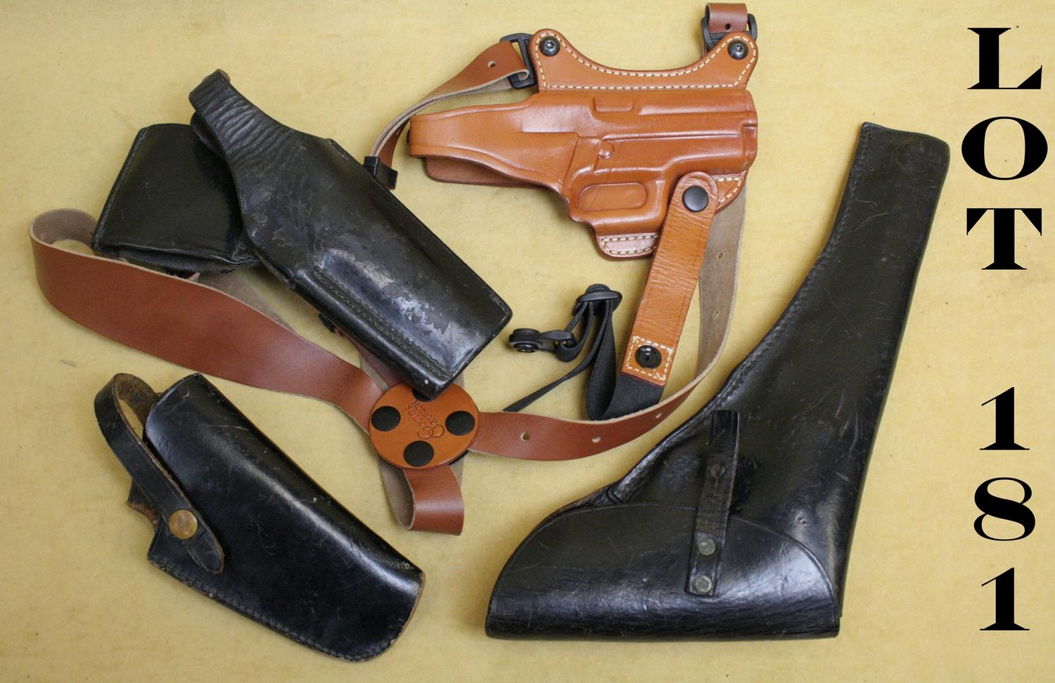 Lot of misc. leather gear including approx. 10 holsters of various makers and sizes, two cartridge belts, one shoulder rig for a semi-auto pistol and holster and cartridge belt for a SAA revolver with 7-1/2” barrel;most of the holsters are at least in good condition and several are like new. Est.: $150-$300.