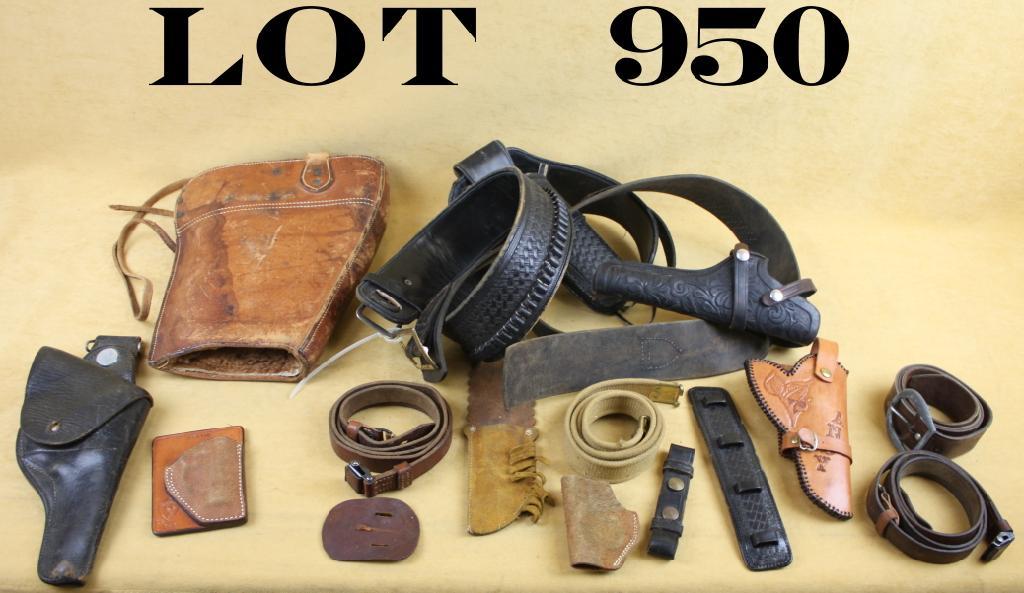 Lot of misc. leather holsters and related items including two holsters and associated cartridge belts, one unmarked, the other made in Mexico; an unmarked military style flap holster for a large frame revolver; aSafariland pocket holster for a small .25 semi-auto pistol; an unmarked tan leather holster with tooled flower and the name “ANDY” for a medium frame revolver; a portion of a lined mutton leg type long arm carrycase and several misc. belts. Est.: $150-$300.