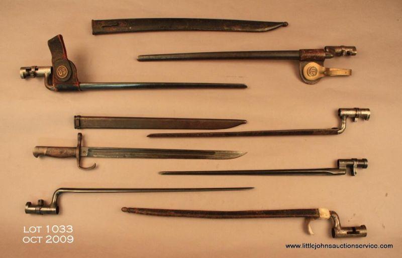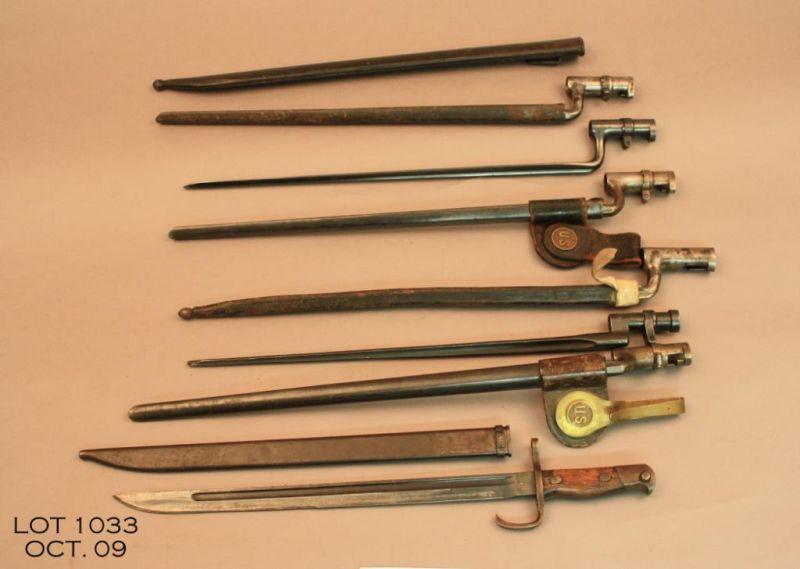 Lot of misc. military bayonets and scabbards including two US marked socket bayonets with metal scabbards and frog hangers; three additional socket bayonets, one with a metal scabbard and one with a leather scabbard; an unmarked four sidedspike socket bayonet approx. 20” overall; an Arisaka bayonet and metal scabbard and an unmarked metal scabbard approx. 20” overall with a ball tip. Est.: $500-$800.