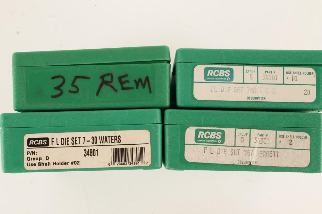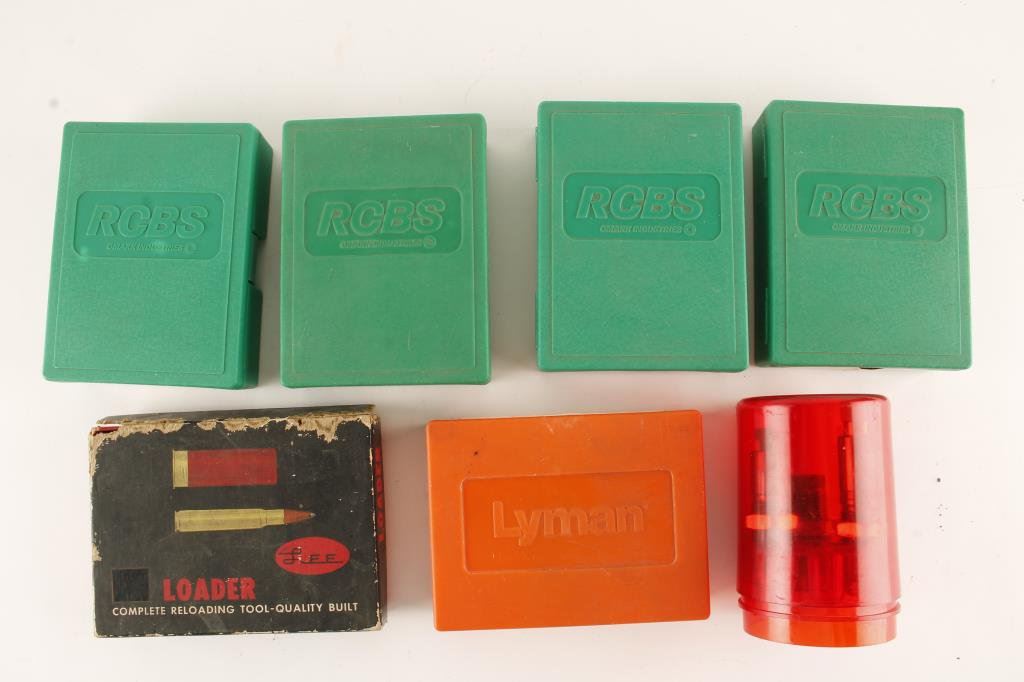 Lot of misc. reloading dies including .30-06, .35 Rem. .30 Waters, .357 Herrett, etc. plus a Lee loader set. Est.: $50-$75.