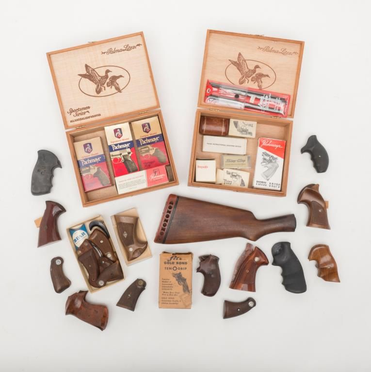 Lot of misc. revolver grips for mostly Colts and Smith & Wessons; a number of Pachmayr grips; many hard-to-find and most in good to very good condition; approx. 20 total plus one rifle butt stock. Est.: $125-$250.