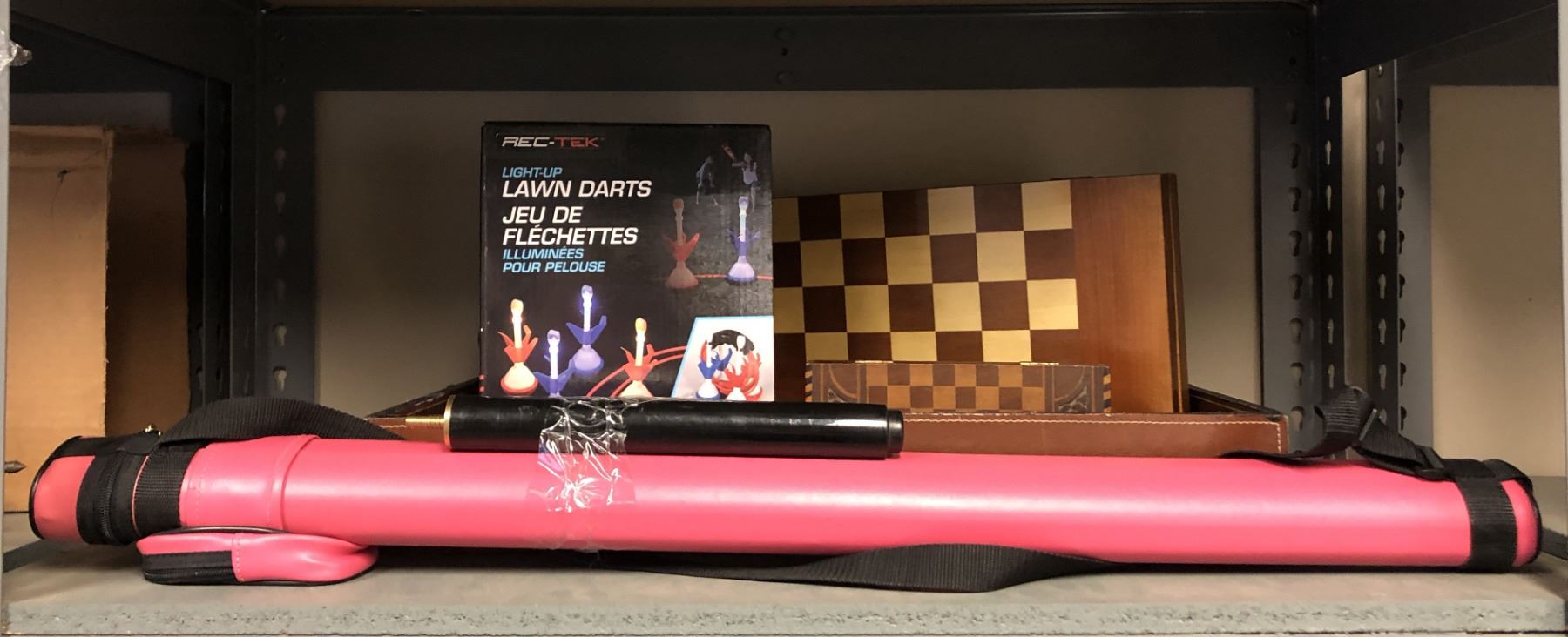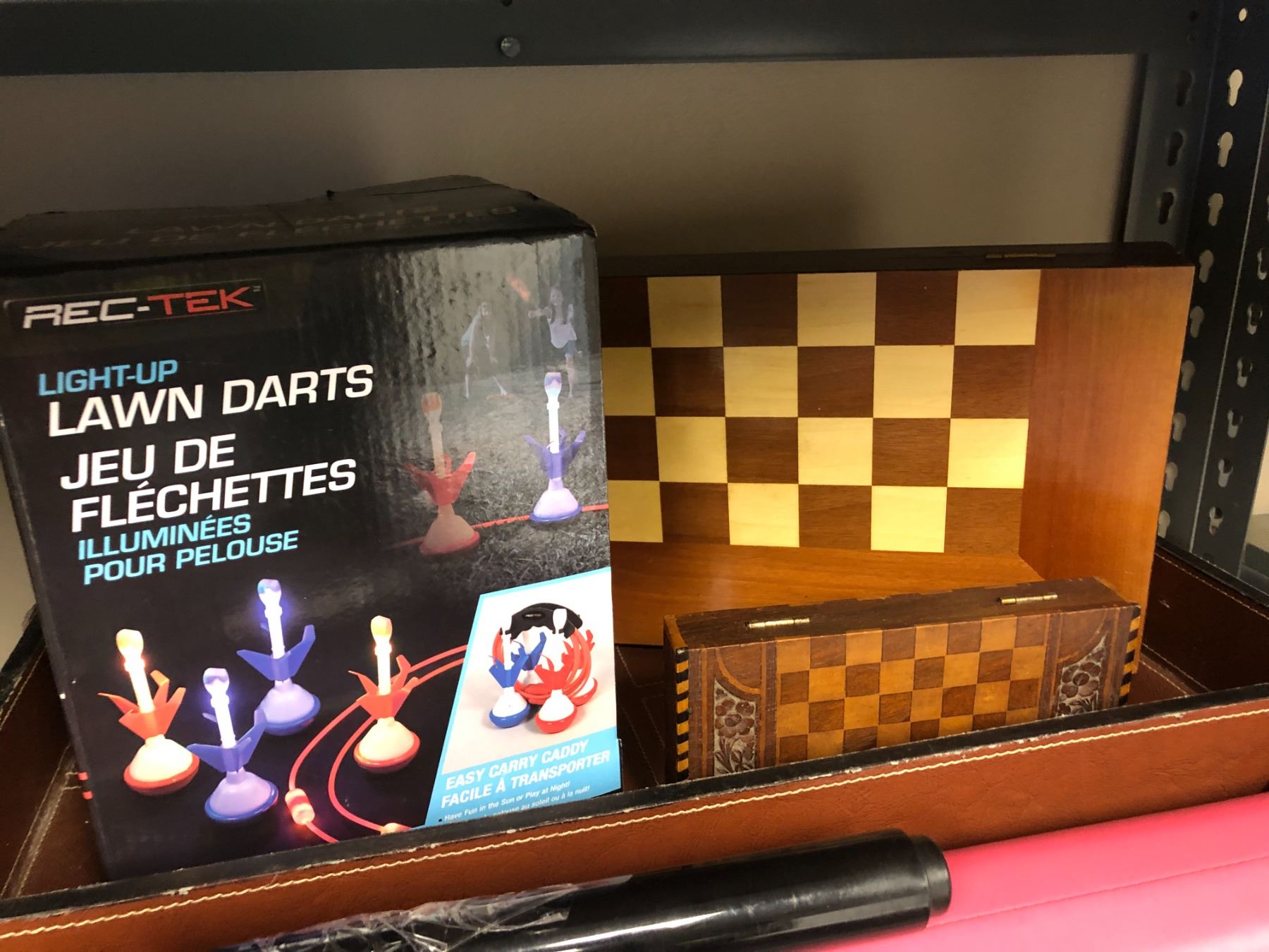 Lot of misc two checker boards, light-up lawn darts, cue stick w/case, etc...