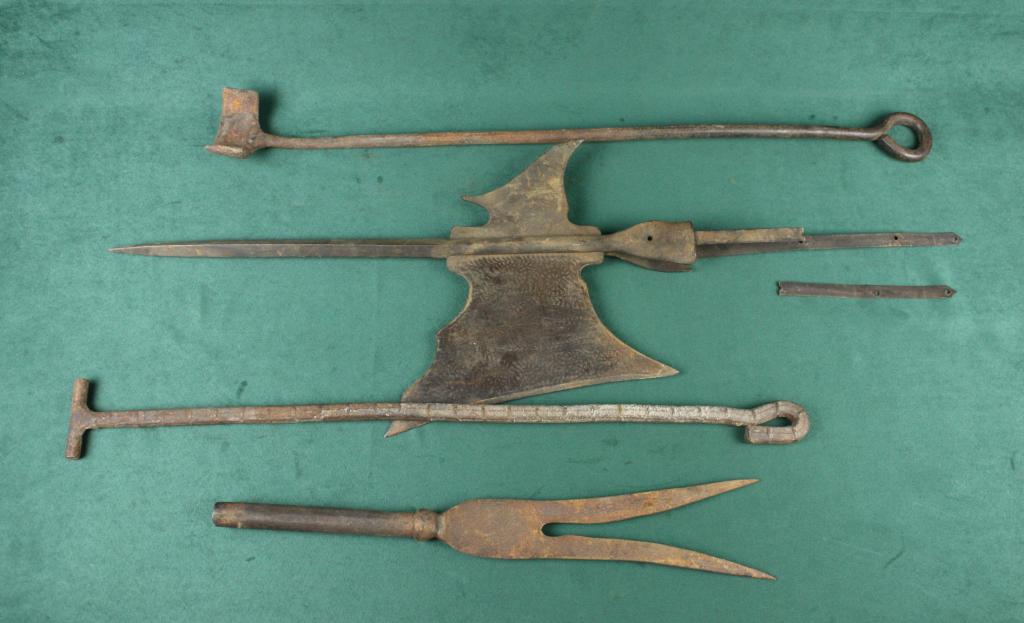 Lot of misc. uncleaned decorator items including a forked spear head, two blacksmith’s tools and a pike head. Est.: $50-$100.