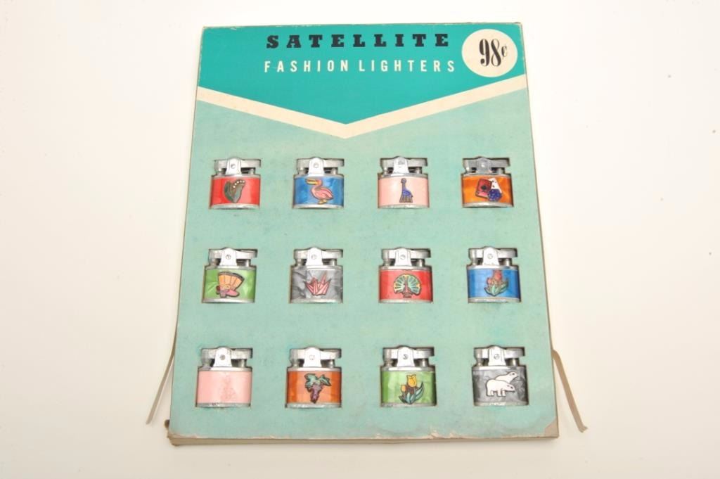 Lot of misc. vintage table and pocket lighters by makers Ronson, Evans and Zippo, etc., including a case of 12 individually packaged “Happy Days” gas lighters; a Satellite store display of 12 differentfashion lighters; a matchbook dispenser; a metal lift arm nude figural table lighter (ca. 1920’s); a brass music box table lighter that turns the “two faced” man when lit; made by Evans and ca. 1930’s; a brass butanetorch table lighter made by Pyro Star, ca. mid-1960’s and more. (Reference: James Flanagan’s definitive work “The Big Book of Cigarette Lighters”). Est.: $350-$500.