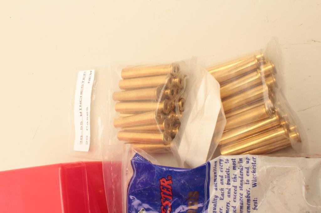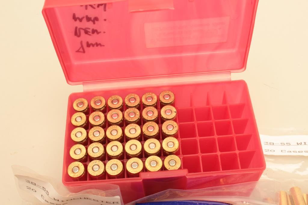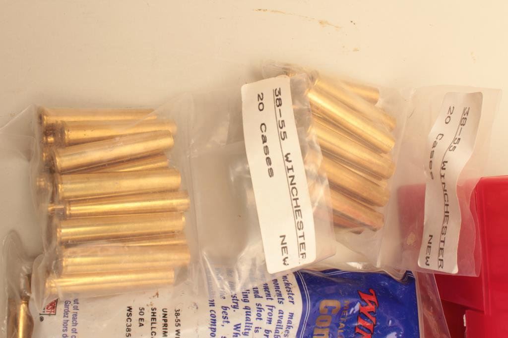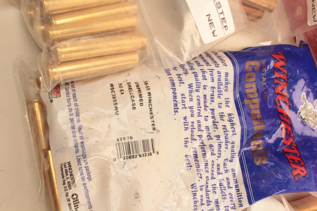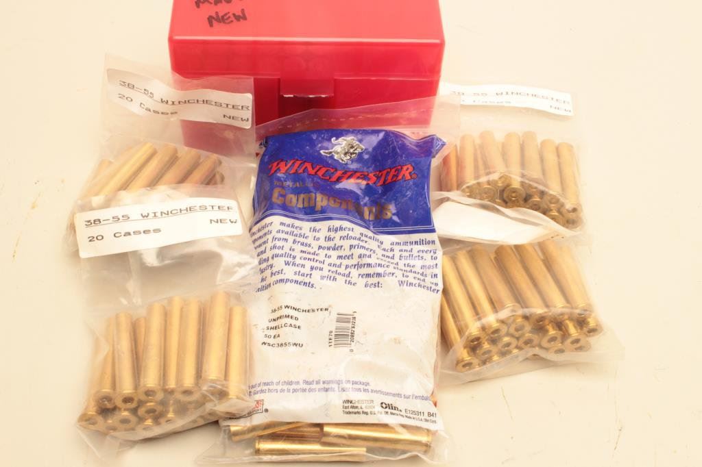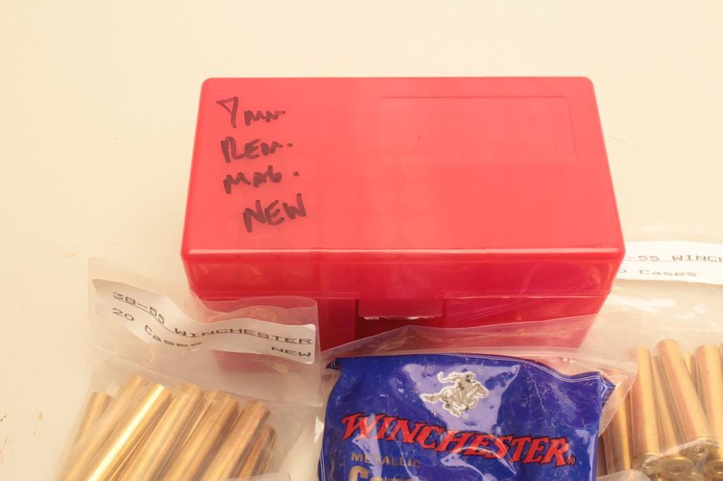 38-55 caliber brass in the bag with the Winchester head stamp. The lot also includes 30 pieces of new, primed 7mm Remington Magnum brass with Winchester head stamp. 160 pieces in total, all new manufacture and unfired. Est.: $100-$200.