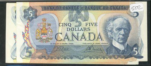Lot of nine 1979 $5 notes. BC-53a and 53b. Grades vary from AU to Uncirculated.