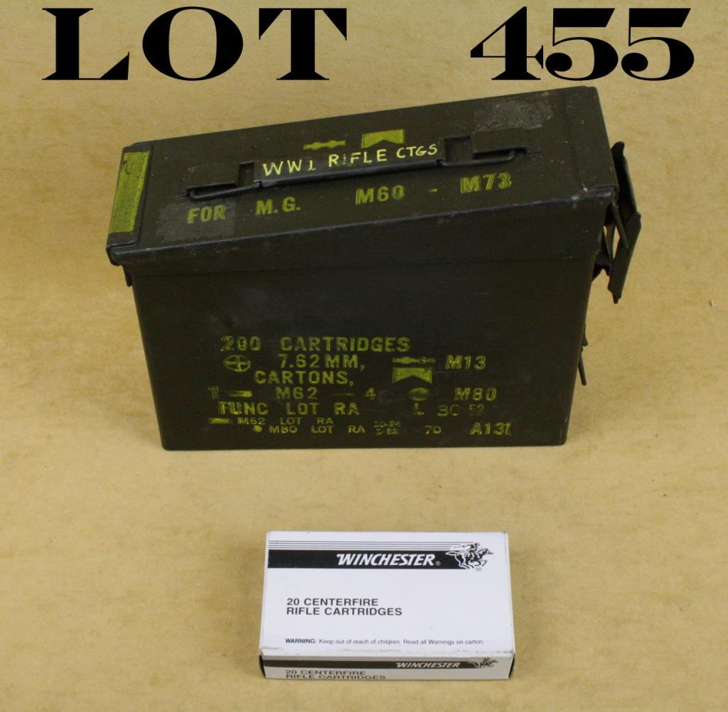 Lot of nine boxes of 20 centerfire rifle cartridges by Winchester in 303 British caliber, all contained in a metal U.S. ammo box. Est.: $50-$100.