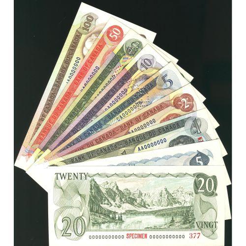 Lot of nine notes Multi-Color Issues Specimen notes BC-46a,47a, 48a, 49a, 50a, 51a, 52a, 53a, 54a. Number 377. Notes are Unc.