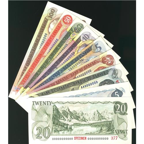 Lot of nine notes Multi-Color Issues Specimen notes BC-46a,47a, 48a, 49a, 50a, 51a, 52a, 53a, 54a. Number 377. Notes are Unc.
