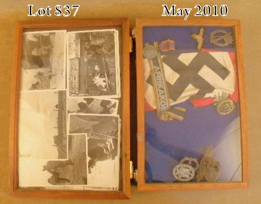 Lot of nine original WW II misc. photos of German soldiers in various locations , many showing weaponry and a grouping of Nazi related metals and a Nazi flag; metals include tank, infantry and U-boat service along with a fabric Afrikakorpsuniform adornment; all from an old collection and appear correct. Contained in two custom wood and glass display cases. A great lot that deserves further research and classification. Est.: $400-$600.
