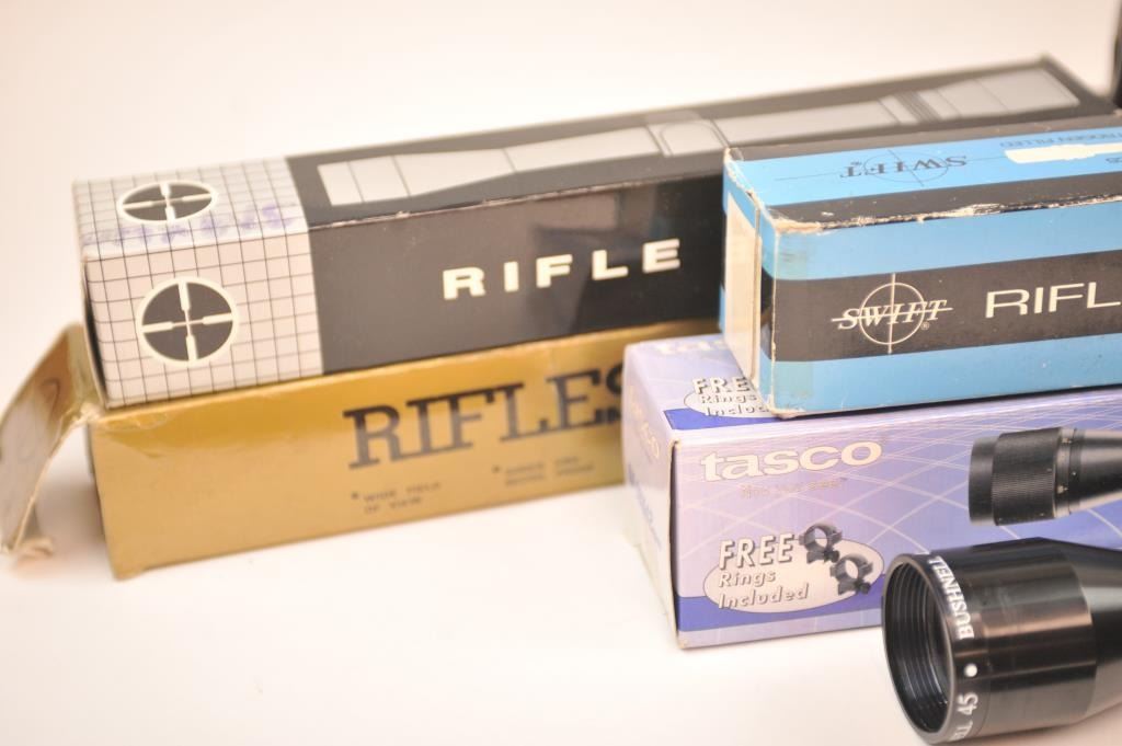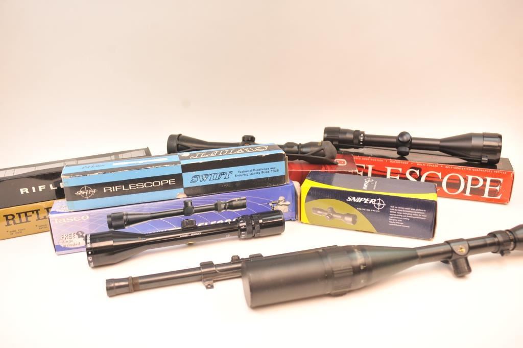 Lot of nine rifle scopes including: a BSA Contender 4 x 16 x 50 with an adjustable objective and sun shade, Weaver B6 with a side mount, Tasco 6 x 18 x 42 in box, Swift 4 x 12 x 50, Bushnell Sport View 3.5 x 10 x45, three Tasco World Class 3 x 9 x 40 variable power and a Sniper 4 x 32 new in the box. All scopes are in very good to new in the box condition. Est.: $350-$700.