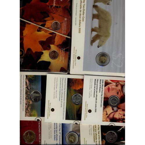 Lot of official first day RCM: 2006 $2 , 2005 Terry Fox $1 (2), 2004 Olympics $1 , 2004 Poppy 25¢, 2005 Veteran 25¢, 2005 Alberta 25¢, 2005 Saskatchewan 25¢, 2005 Breast Cancer 25¢, 2006 Medal Bravery 25¢ (2), 2005 (1945-2005) 5c, 2005 (Set 1c to $2 :