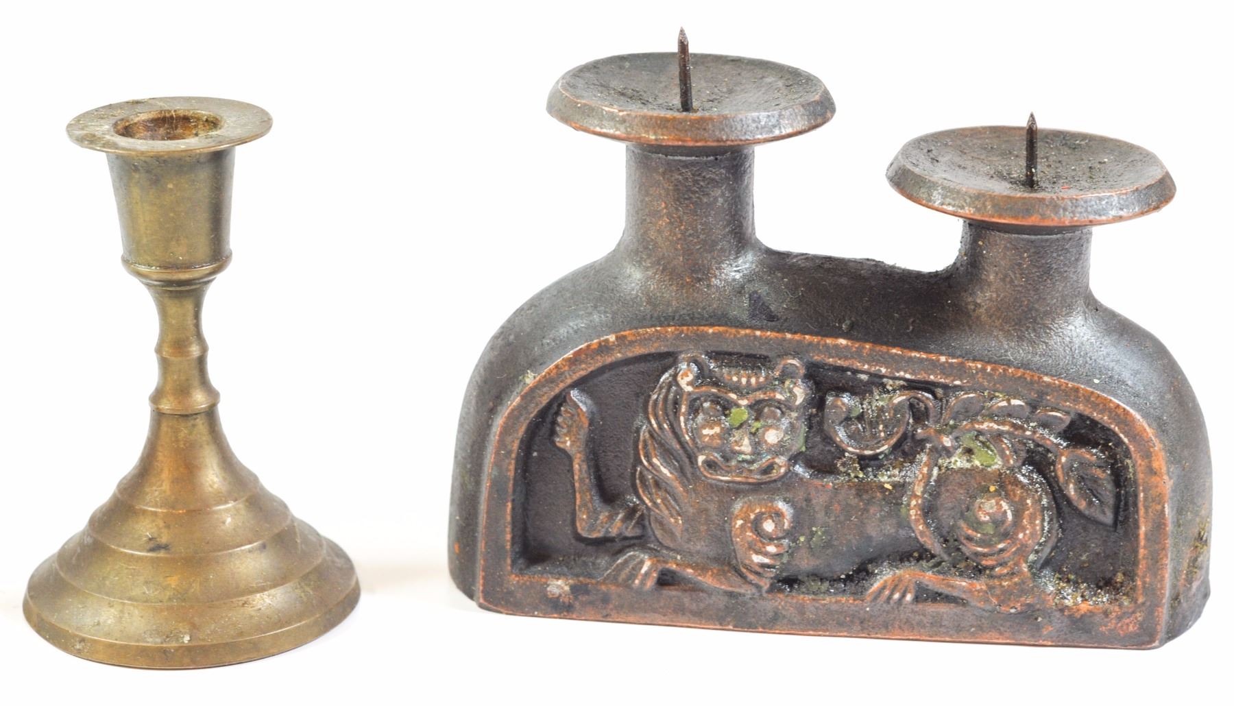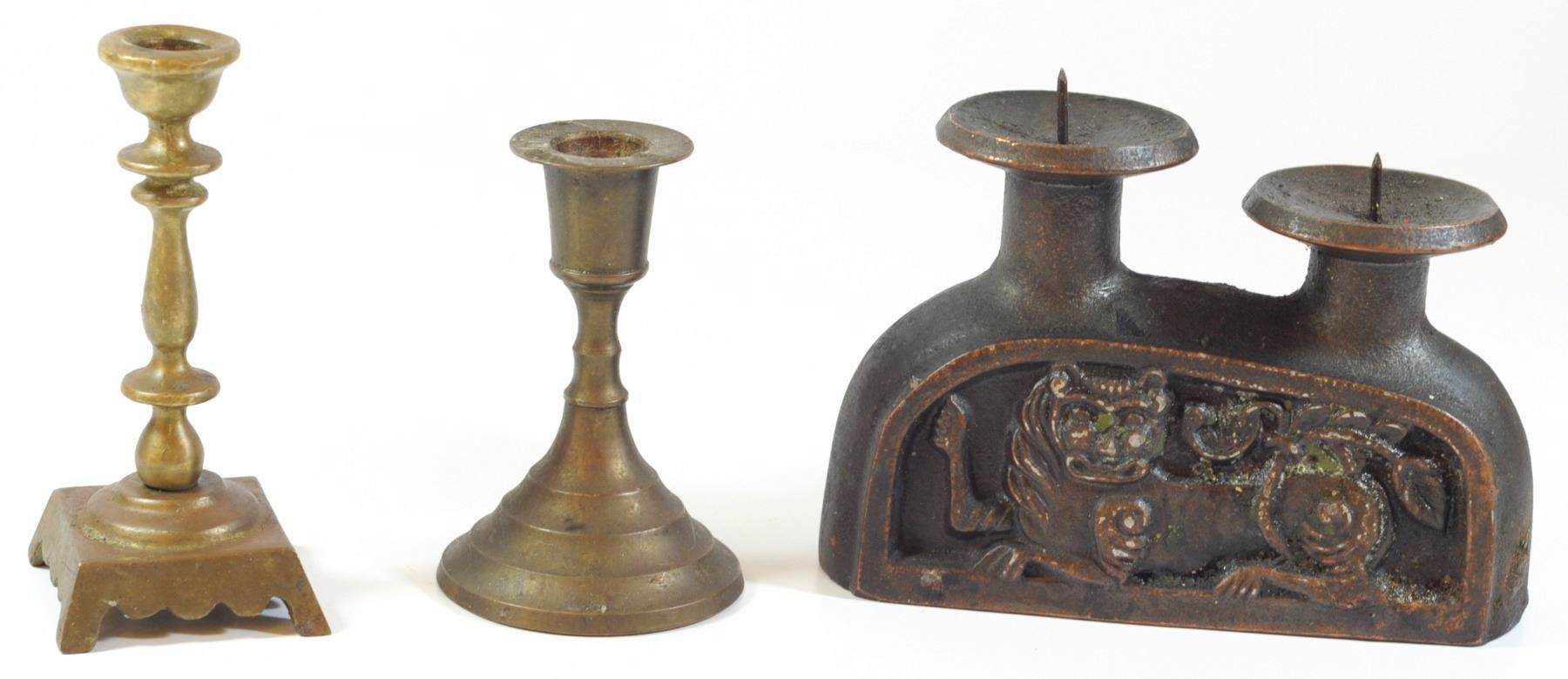 Lot of old metal candlesticks, includes double-branch Russian canldestick with a relief lion and 2 single candlesticks with different patterns. Height: 9.5-11.5 cm.