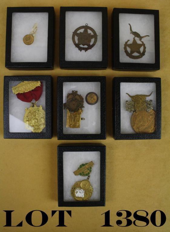 Lot of old stockyard pins and ribbons in 7 small riker mounts including a cattleman’s convention pin, a National Livestock Assn. pin, a Kansas City Stockyard pin, a 1901 National Livestock Assn ribbon and medal, anArizona Cattle Grower’s Assn. 1916 medal, etc. Est.: $250-$500.