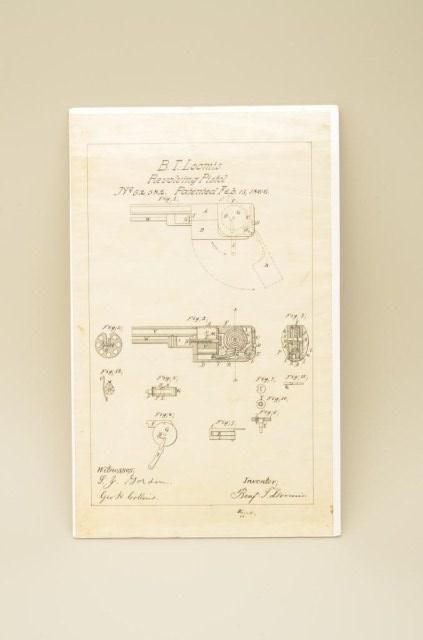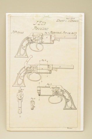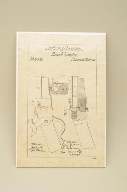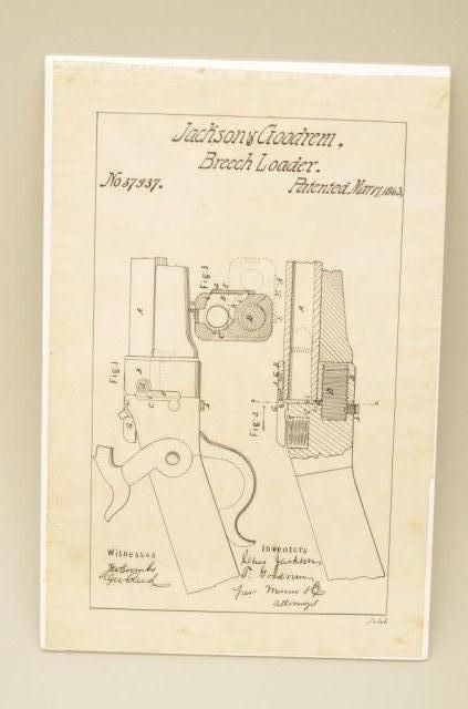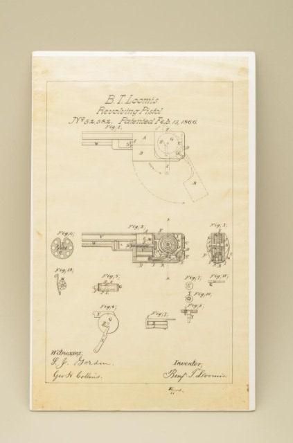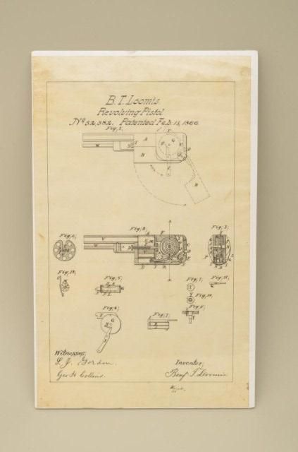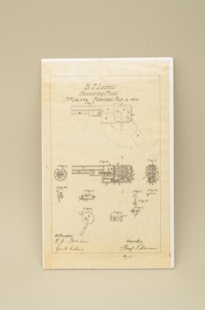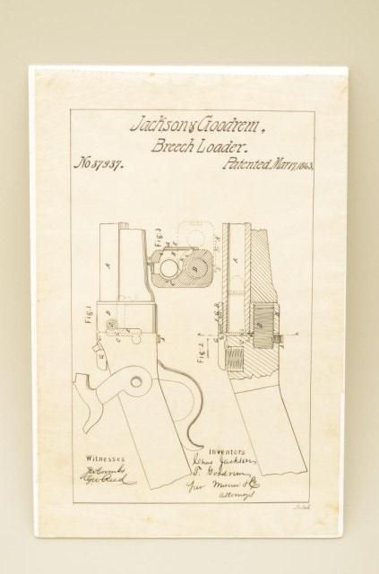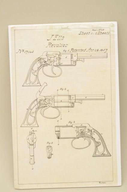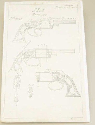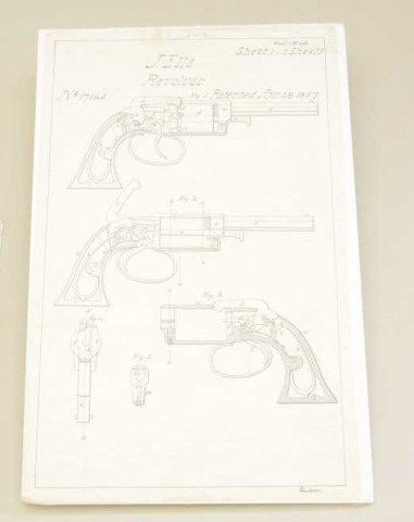 Lot of original patent papers for firearms purchased by legendary Bowie and California Collector Bill Williamson from the U.S. Patent office sale. Consists of 1. J. Ells revolver drawing- No. 17143, 1857, 16-3/8” by 10” signed Hudson. Mounted on board. 2. Loomis revolving pistol Feb. 13, 1866 “oddity” seven shot revolver 18” by 11” signed by artist. 3. Johnson and Goodrem breech loader March 17, 1863. 15-1/2” by10-1/4” signed by artist. All good to very good and original. Est.; $300-$600