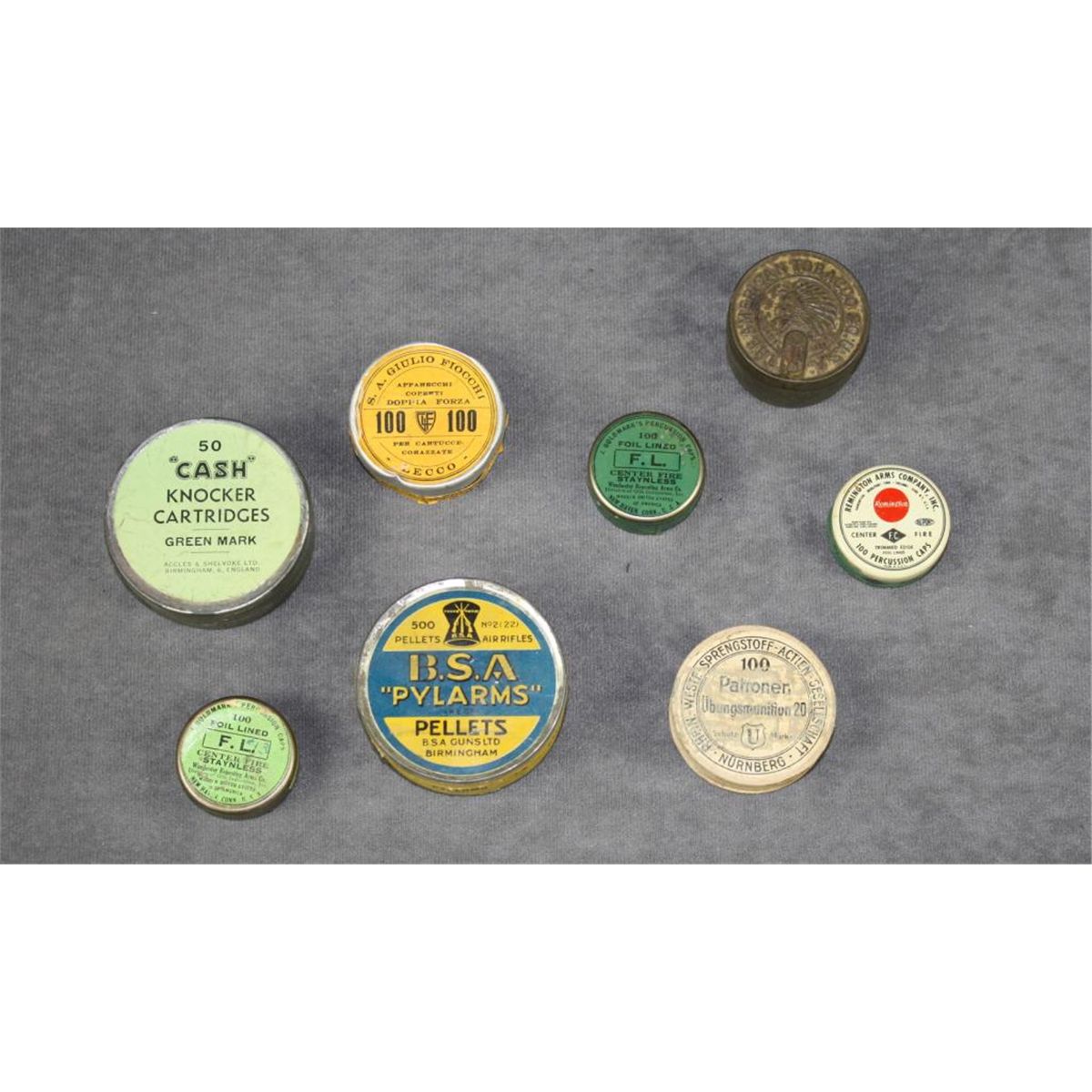 Lot of percussion cap tins, old and new, and several pellet tins by various makers, Goldmark’s, Winchester, Remington Arms, etc.; approx. 24 tins. Est.: $75-$150.