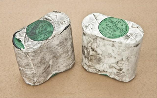 Lot of pistol caps in original paper outside wrapping, green labels show 100 Colt Pistol caps made by Eley Bros, London. 10 tins in each package. Both packages show some slight staining, deterioration, opening at the edges. One exterior is good to very good, one is very good to near excellent. It’s unusual to find unopened packages of tins. 20 tins total. Est: $600 - $1,200