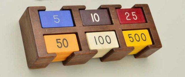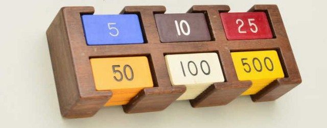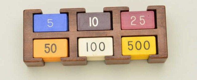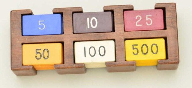 Lot of rectangular gambling chips in wood rack in denominations of 5, 10, 25, 50, 100 and 500 in colors respectively, blue, brown, red, dark yellow, white and light yellow; in overall fine condition. Est.: $100-$200.