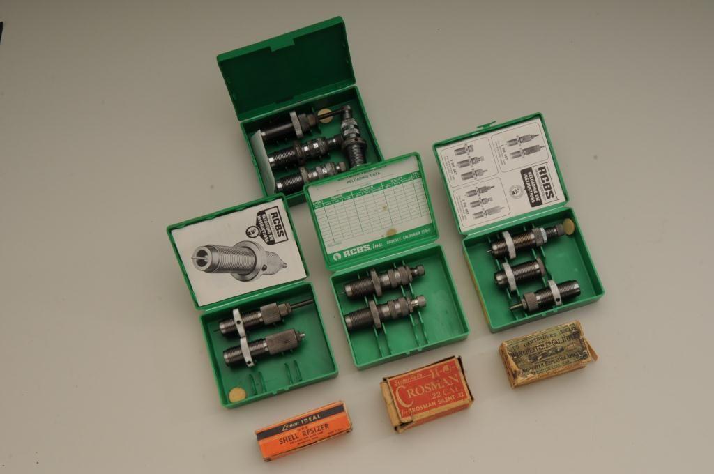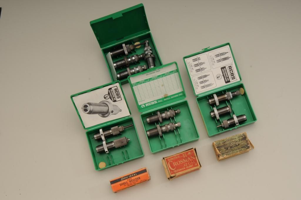 Lot of reloading dies including .357 Mag., .41 Colt, .303 Sav. and .35 Rem; also 3 Lyman Ideal shell resizers, .35 Rem, .33 Win. and .43 Spanish; one .357 single cavity mold, a box of Crosman .22 pellets and a box ofWinchester .32 cal., cartridges for the 1873 Winchester rifle, both boxes are partials. Est.: $300-$600.