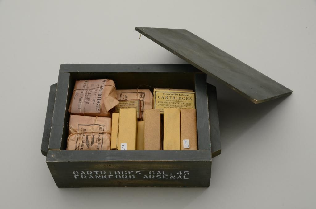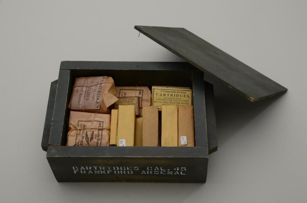 Lot of reproduction ammo blocks in wrappers including 12 packs of Frankford Arsenal, 1877-dated 12 Revolver Ball Cartridges Calibre, .45; 4 packs of St. Louis Arsenal 1864-dated .58 cal. musket 65 grains; 1 packof 10 cartridges with 12 caps 58/100 cal. Richmond Arsenal 186_; 2 packs of 6 Combustible Envelope Cartridges Expressly for Colt’s Patent Revolving Holster Pistols, 44/100 inch caliber; 1 pack of six seamlessskin cartridges for Colt, Whitney or Remington Navy pistols, 36-100 calbre and 1 pack 6 combustible envelope cartridges for either Colt’s or Whitney’s Police Pistols, 36-100 inch Calibre; all in wood militarycarry box. Est.: $200-$300.