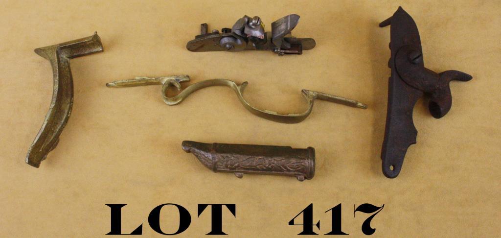 Lot of reproduction parts for blackpowder longarms including a Dixie Gun Works octagon barrel percussion rifle in .52 cal., 36” long; a flintlock lock, a percussion lock, several brass cast parts, a double settrigger and a reproduction small hand cannon made of brass. Est.: $50-$75.